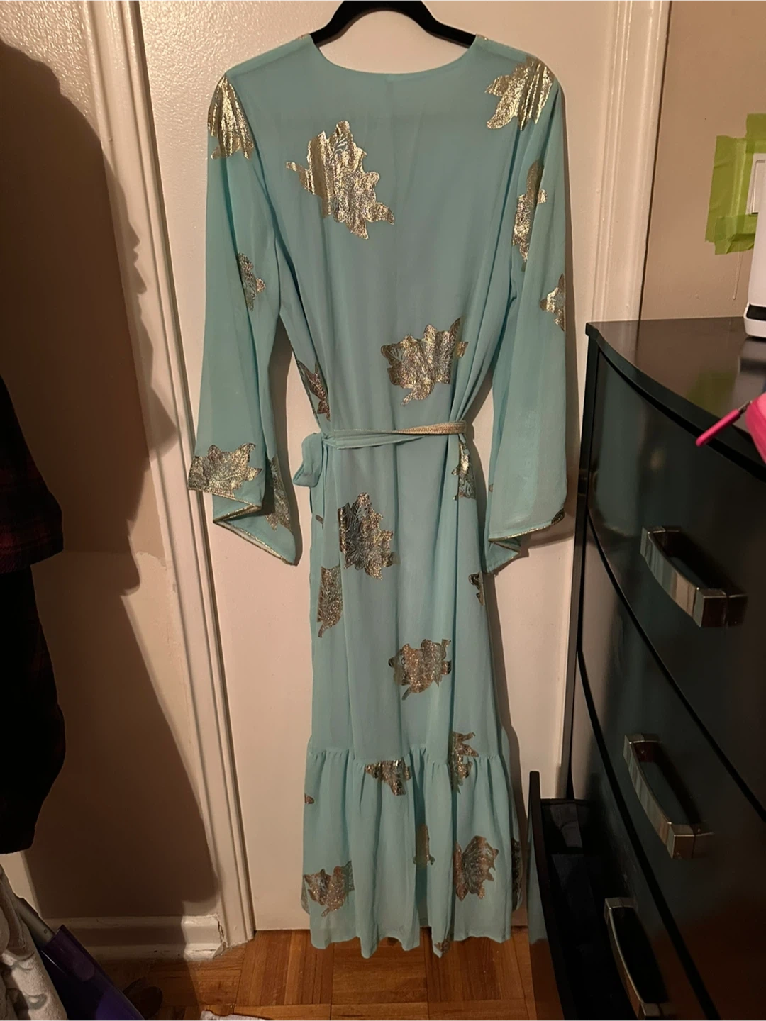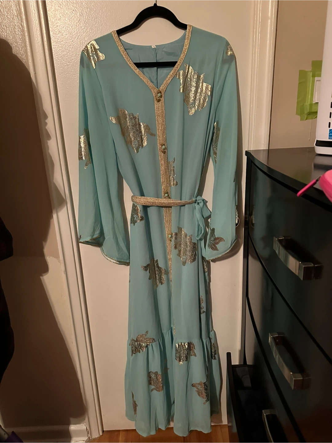 Flowy light blue kaftan dress with a gold leaf print. It has long bell sleeves and a ruffled hemline. Comes with a matching belt.