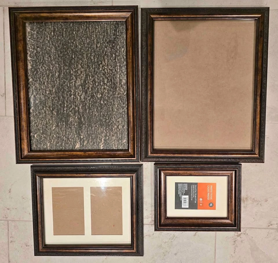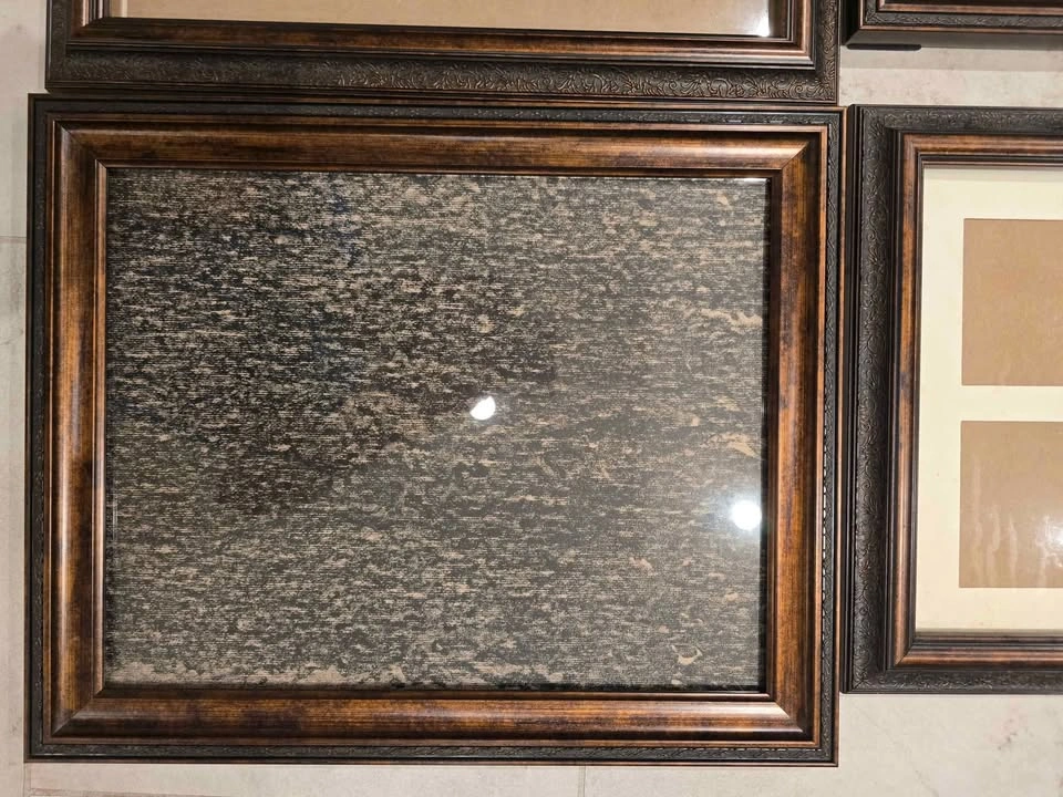 78Like new condition. Dark Bronze or brown type finish. Multi frame 2x 5x7, Single 5x7 or matted 3.5x5, 2 Large 10x13. $10 for all!