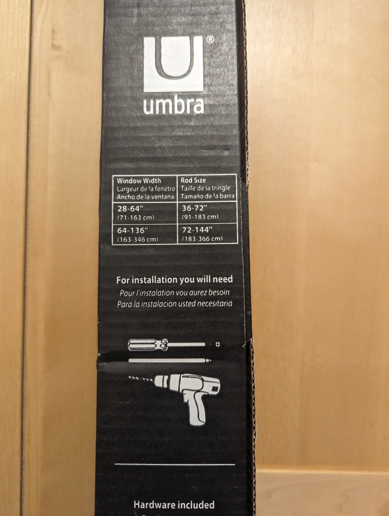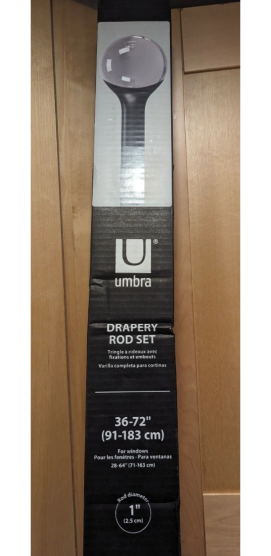 New in box Umbra drapery rod set. 36-72 inches (91-183 cm). Includes hardware for installation. Suitable for windows 28-64" (71-163 cm) or 64-136" (163-346 cm). I have another one that has been used but is in perfect condition. If interested in 2, price would be 40$ for both.