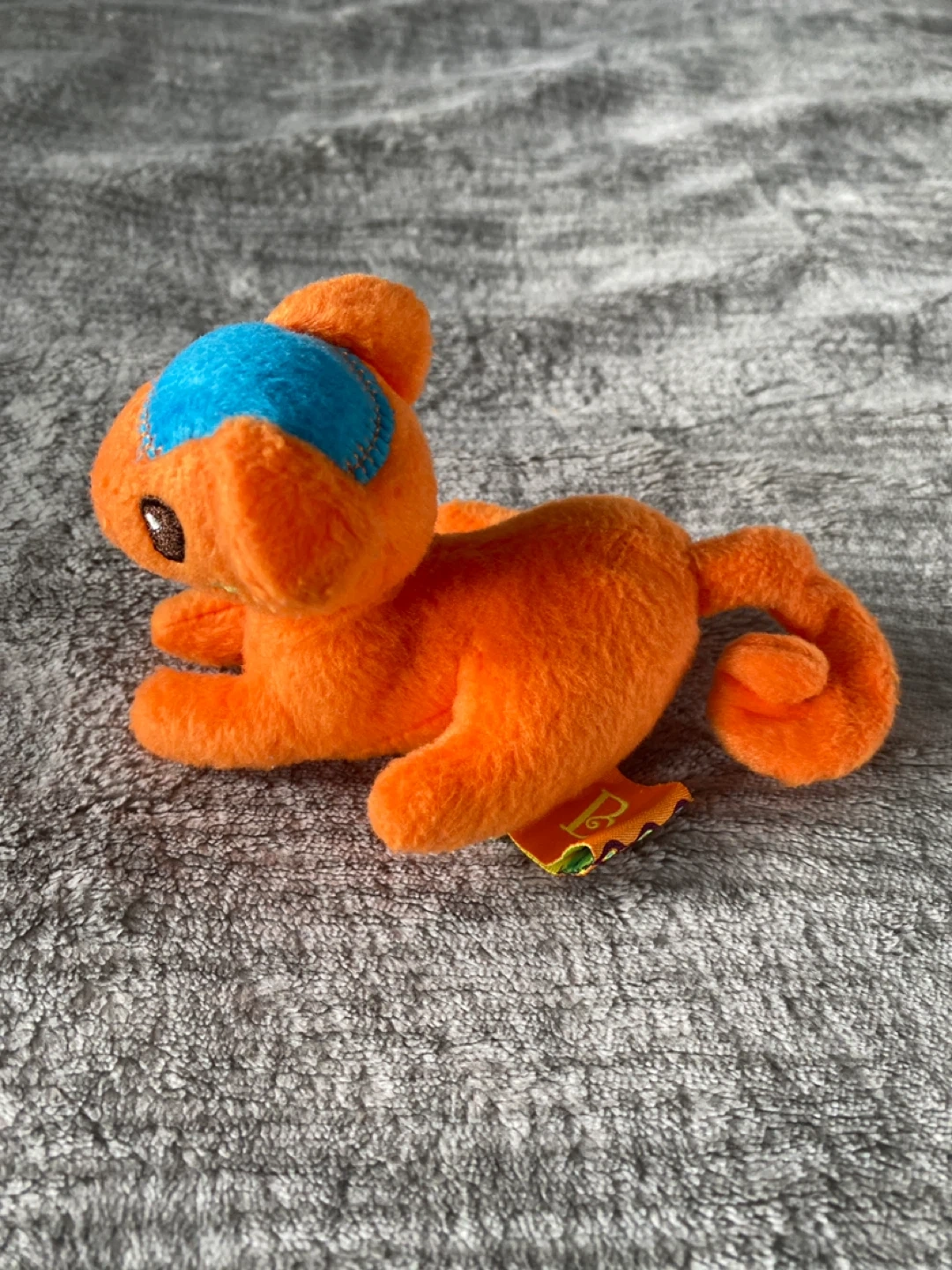 This is a small (4 inches long), orange plush toy with a bright blue accent on its head. It has embroidered eyes and nose. Its tail is curled. This plush toy is soft to the touch.