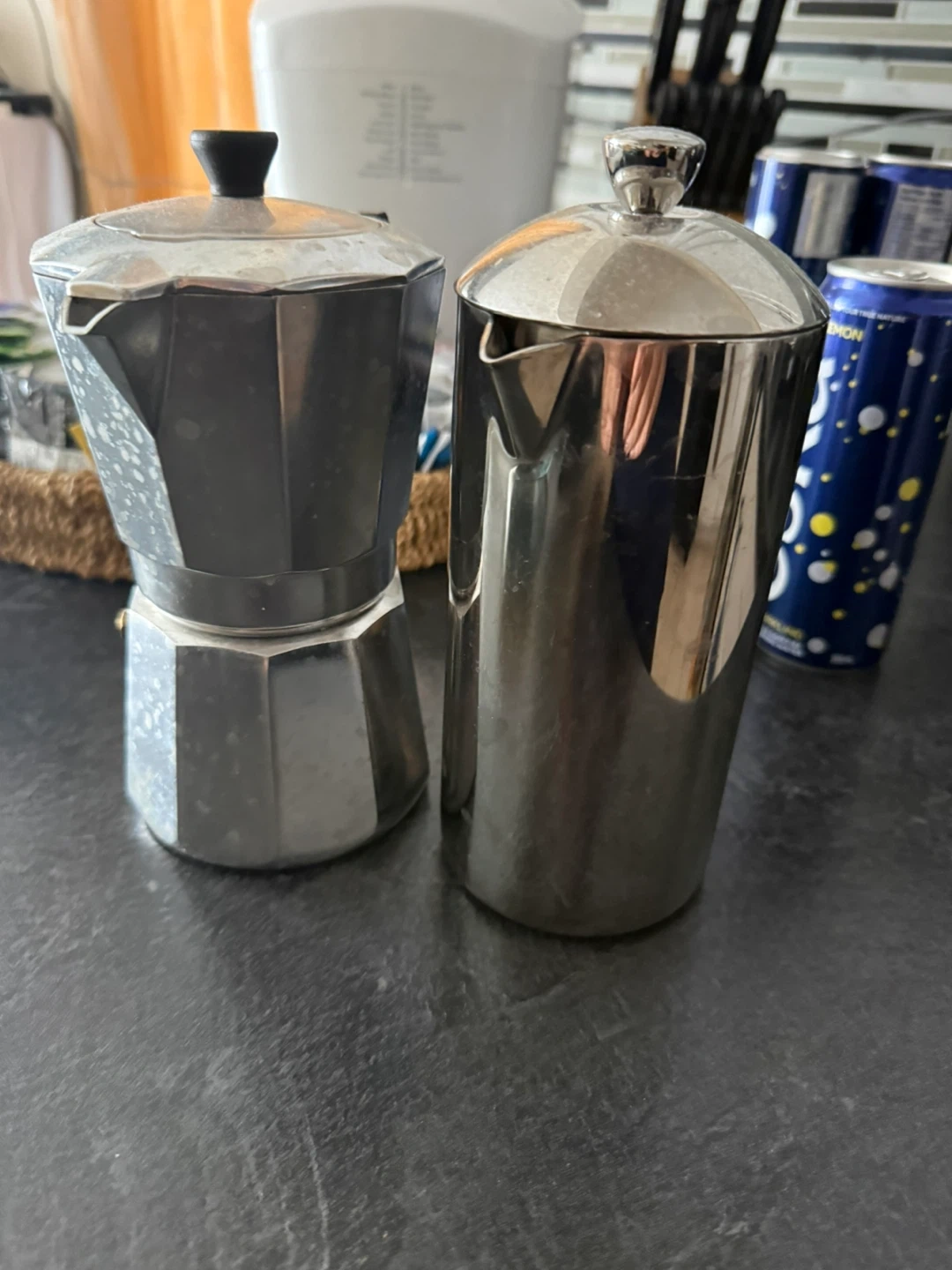 Aluminum stovetop espresso maker and stainless steel French press. These coffee makers are for brewing your favourite coffee at home. They're made of durable materials for long-lasting use.