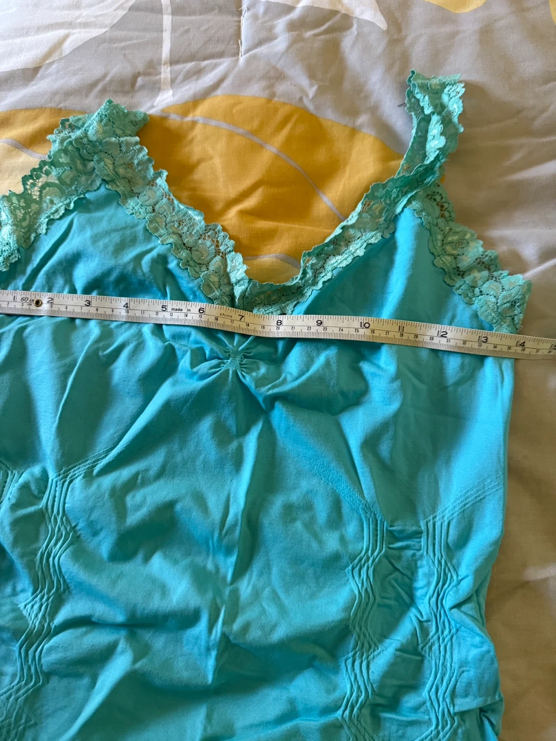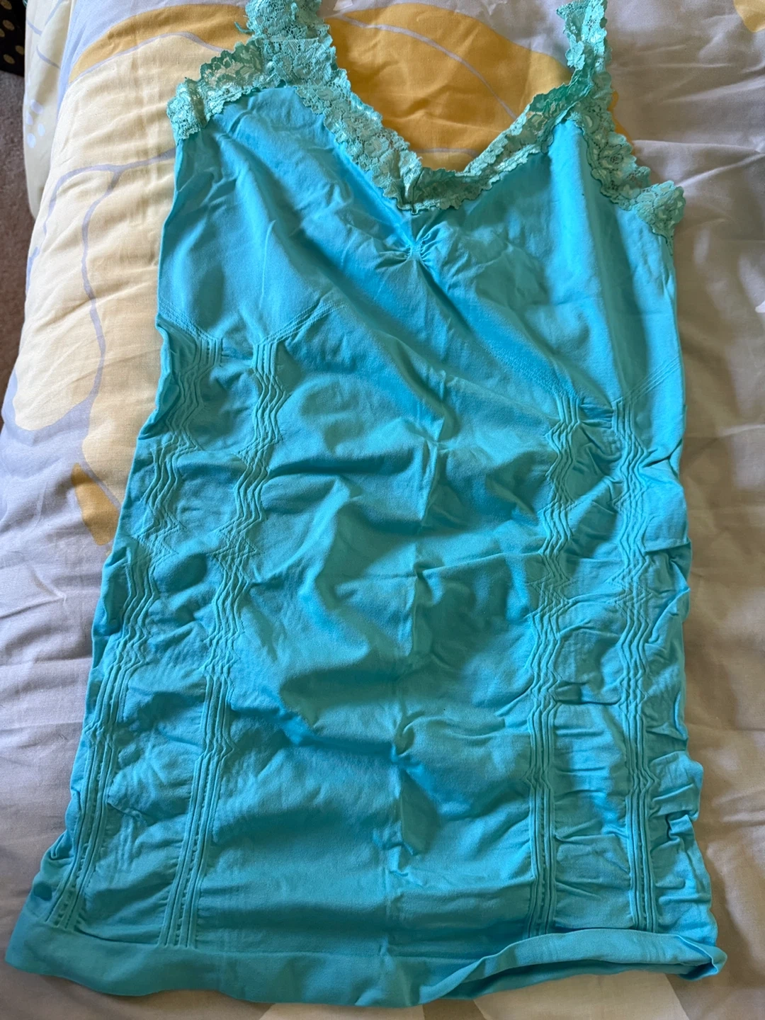 This Kismet camisole is size L and features a pretty blue colour with delicate lace trim. It's made from a blend of 92% nylon and 8% spandex for a comfortable fit. A nice layering piece for any wardrobe!