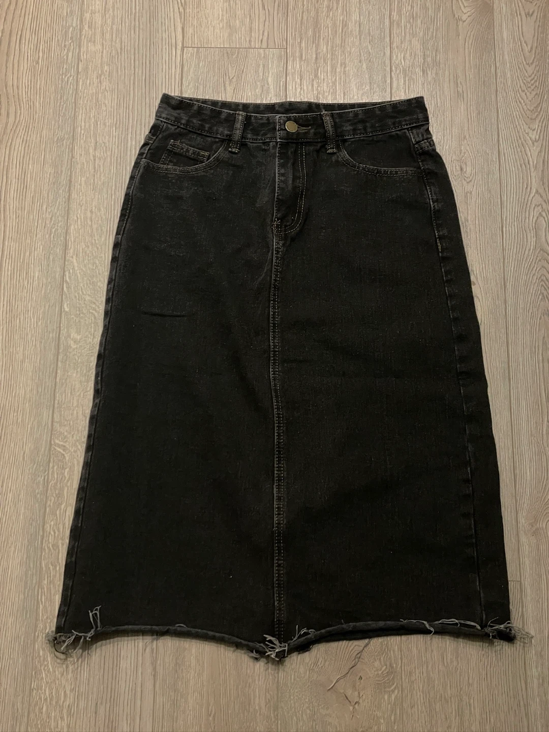 Here's a stylish dark grey denim midi skirt! It's in great condition and ready for a new wardrobe. The skirt is made of denim material and features a classic midi length. Perfect for casual outings or dressing up with a cute top!