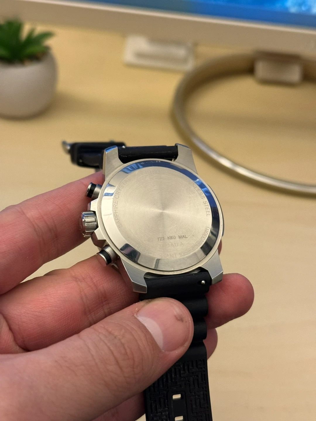 This Tissot watch features a chronograph function and a stainless steel case with a black rubber strap, brown or green (or al together)