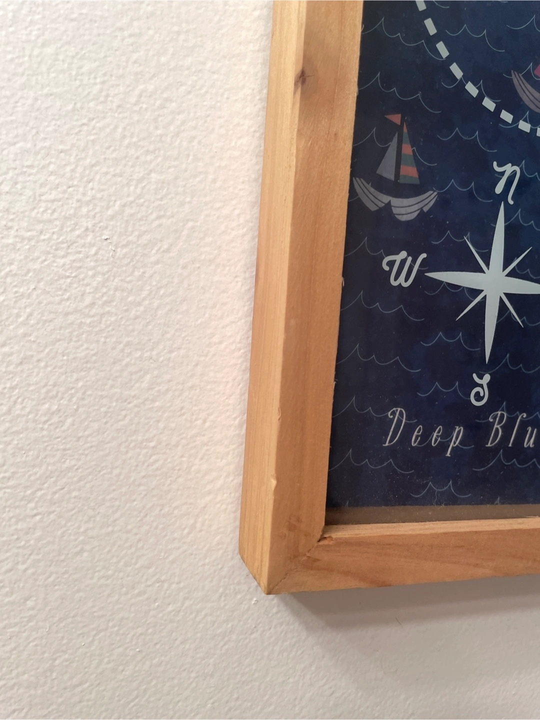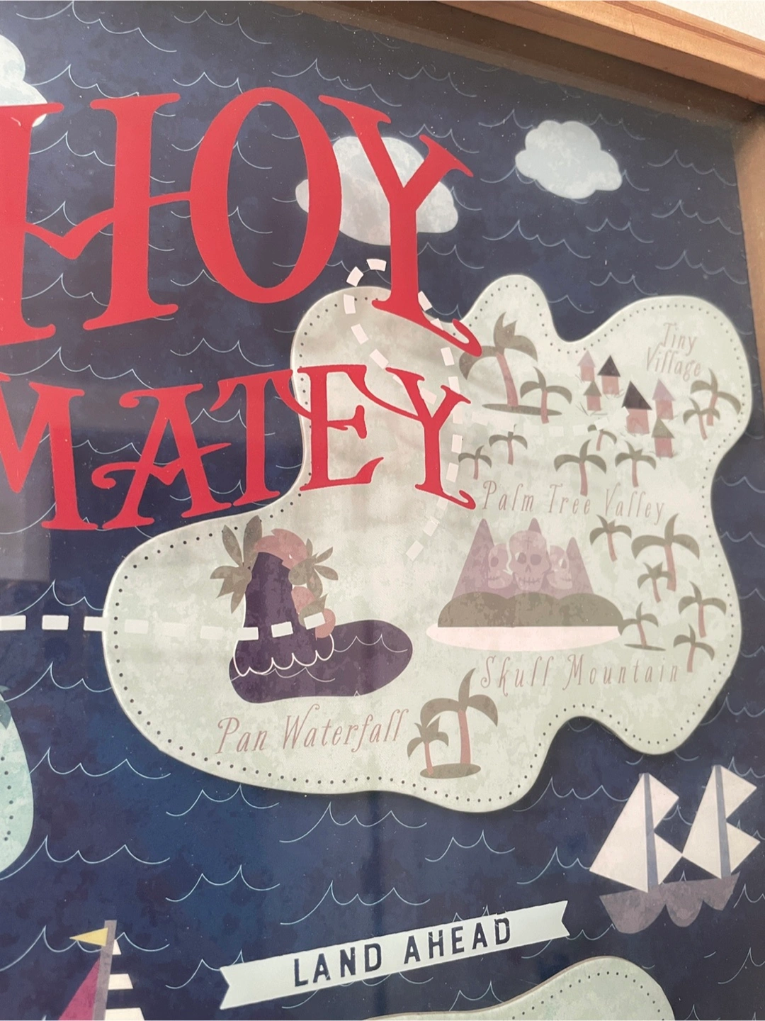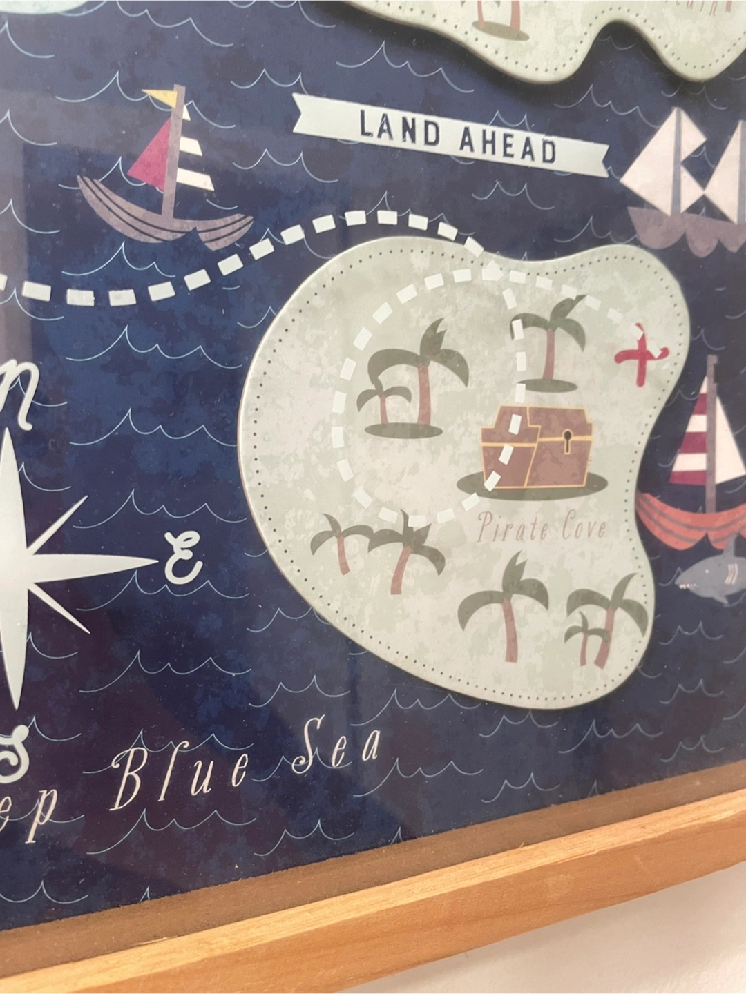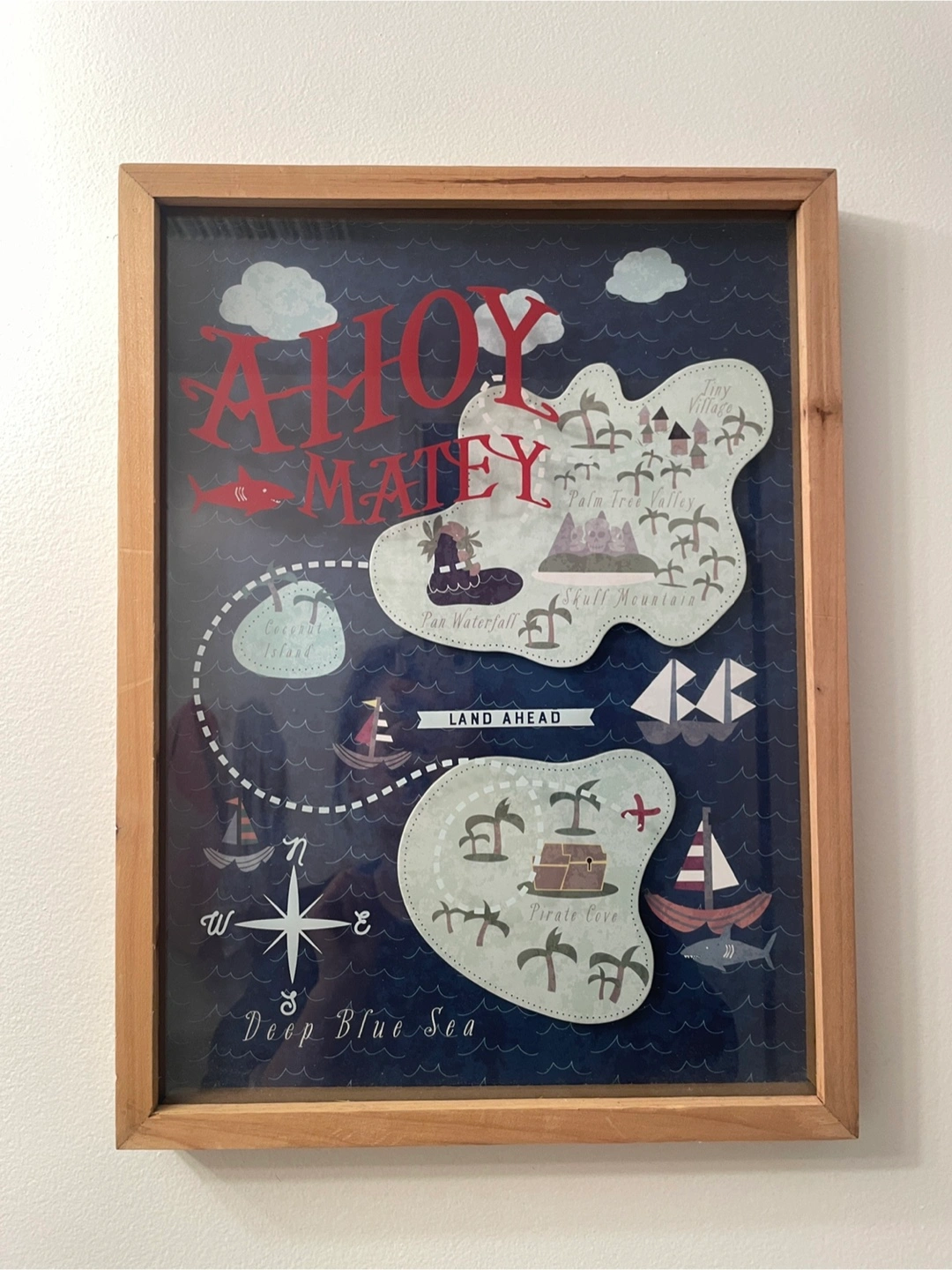 This charming framed wall art features a pirate-themed map with playful illustrations and the words 'Ahoy Matey'. It's ready to hang and adds a fun touch to any room. Wood frame.