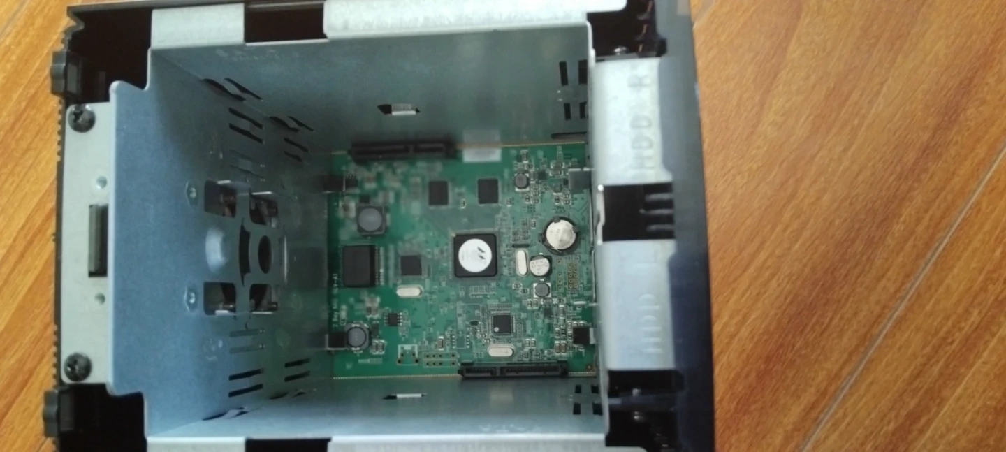 D-Link ShareCenter network attached storage device. Black plastic casing. This unit is designed to hold hard drives for network storage. Requires internal hard drives to operate.