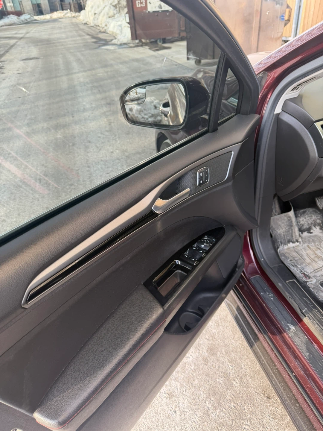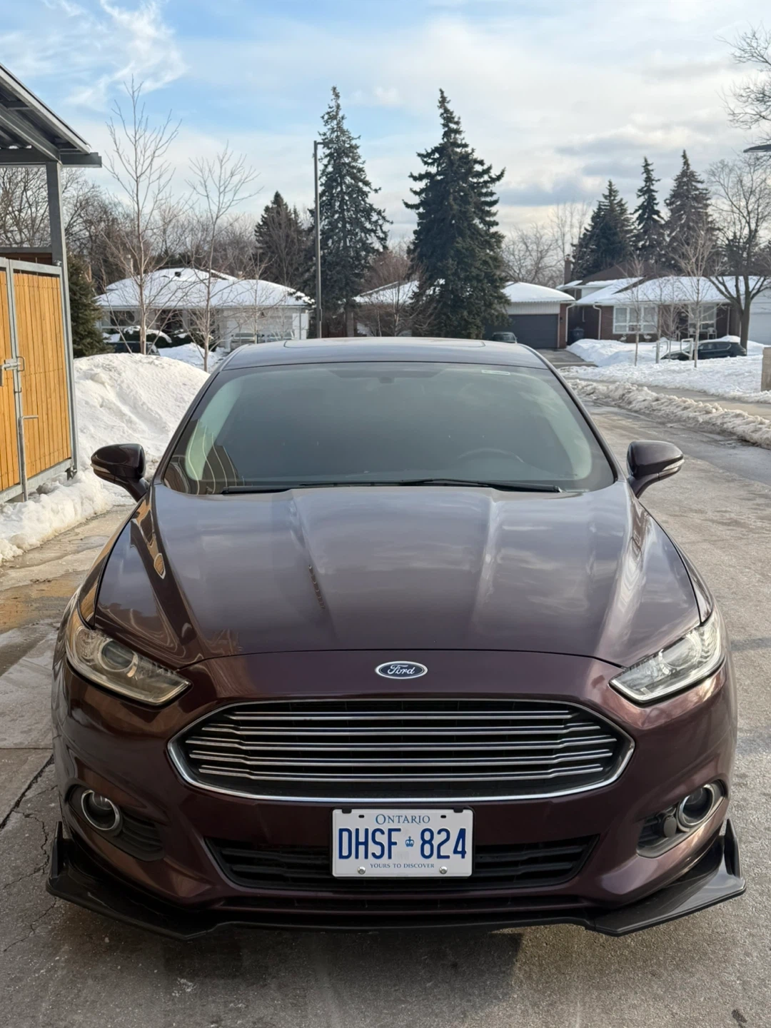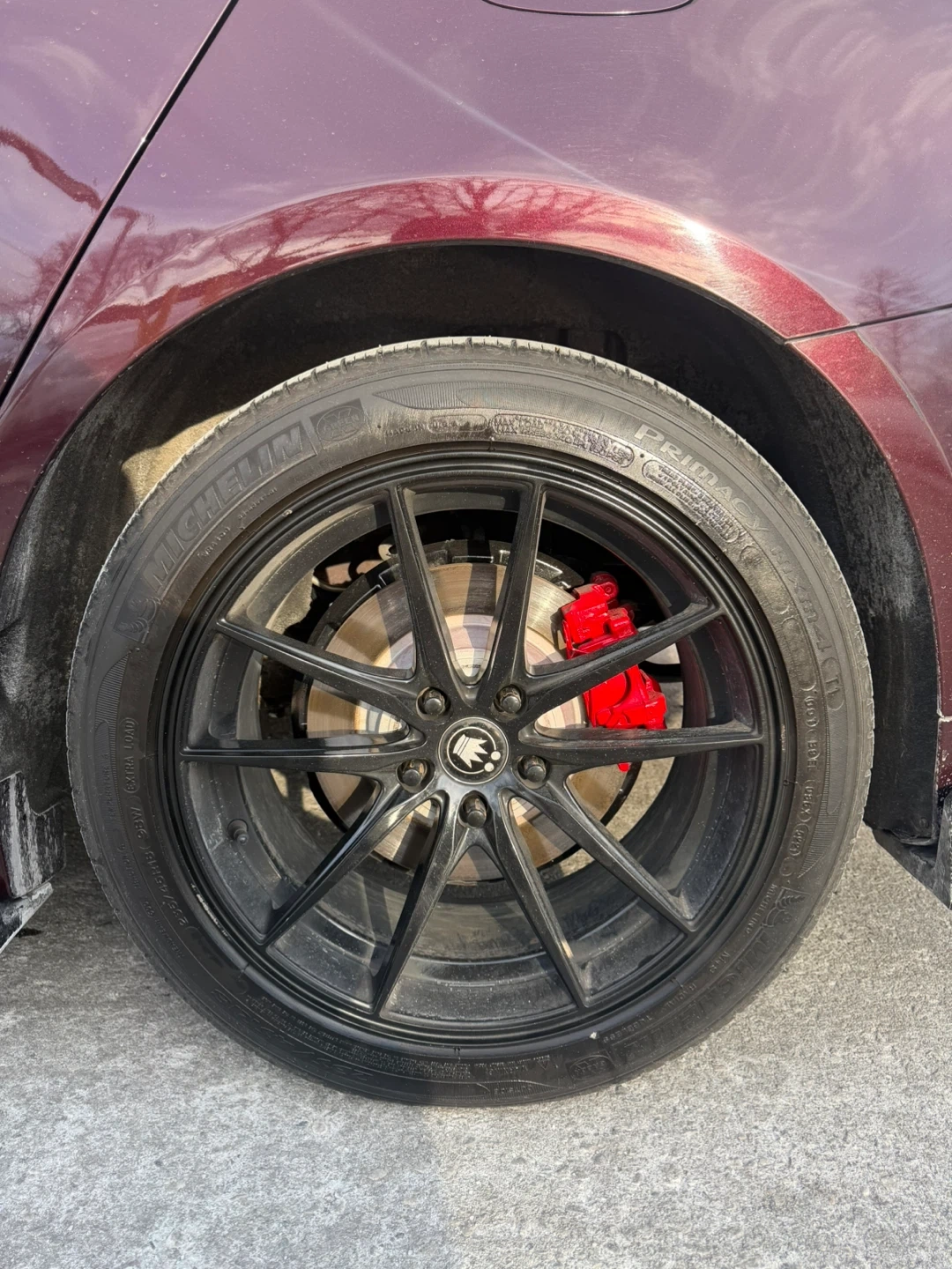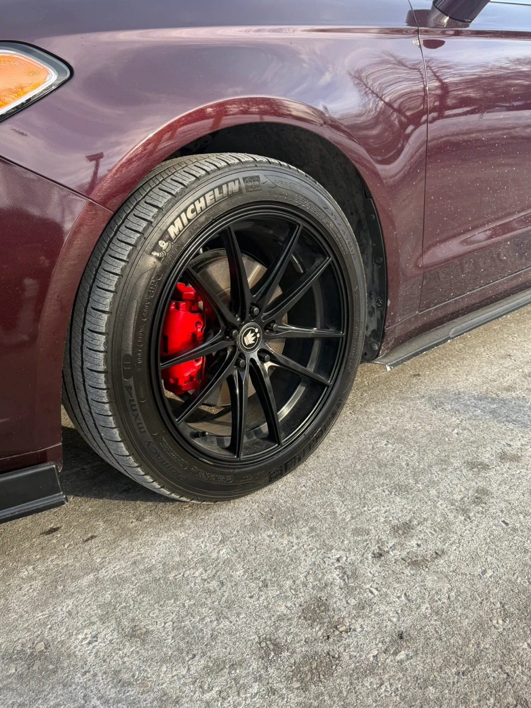 This is a Ford Fusion sedan in a deep burgundy colour. It's equipped with black rims and red brake calipers. Tires are Michelin brand.