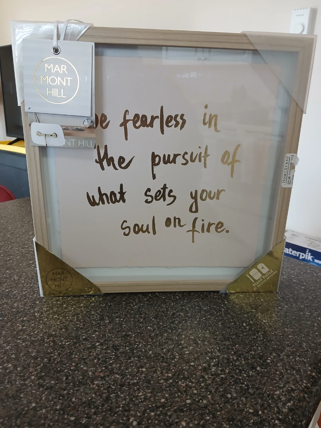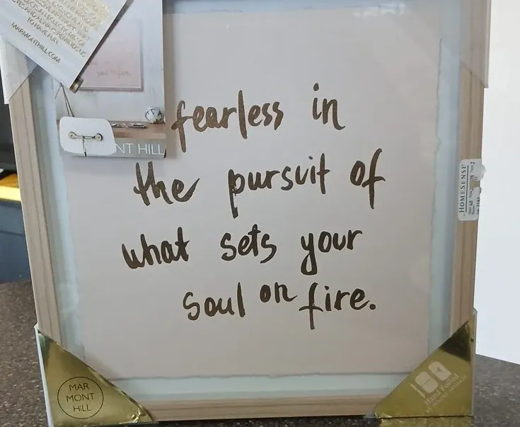 Marmont Hill framed art with the quote "fearless in the pursuit of what sets your soul on fire." It's framed in light wood and ready to hang. This piece aims to inspire and add a touch of personality to your space.