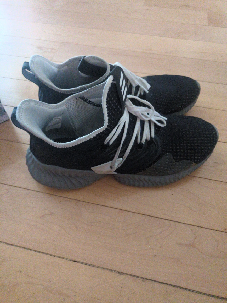 These are running shoes. Black and grey in colour. The soles appear to be a bit elevated. They are laced up with white laces. These shoes could be great for your next workout session, helping you feel prepared and ready for anything.