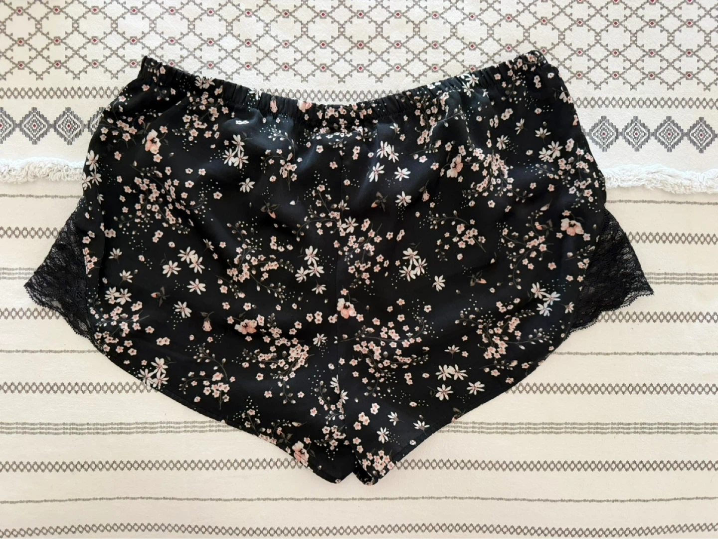 Black satin pajama set with a ditsy floral print and black lace trim. Includes a cami top with adjustable straps and matching shorts. Size is small. In excellent condition.