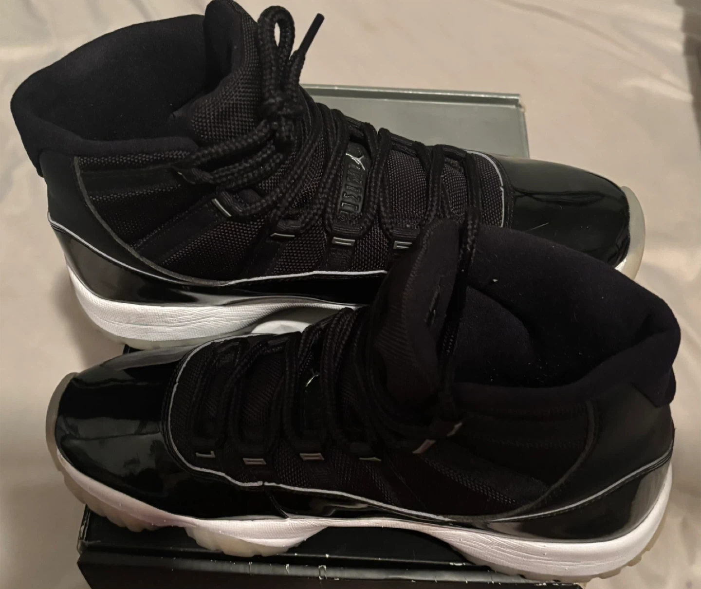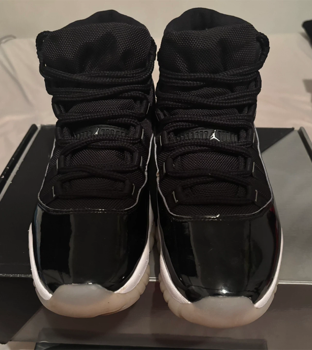 These are Air Jordan 11 Retro sneakers in black. They feature a patent leather toe box and accents, with textile and leather uppers. The size is men's 9.