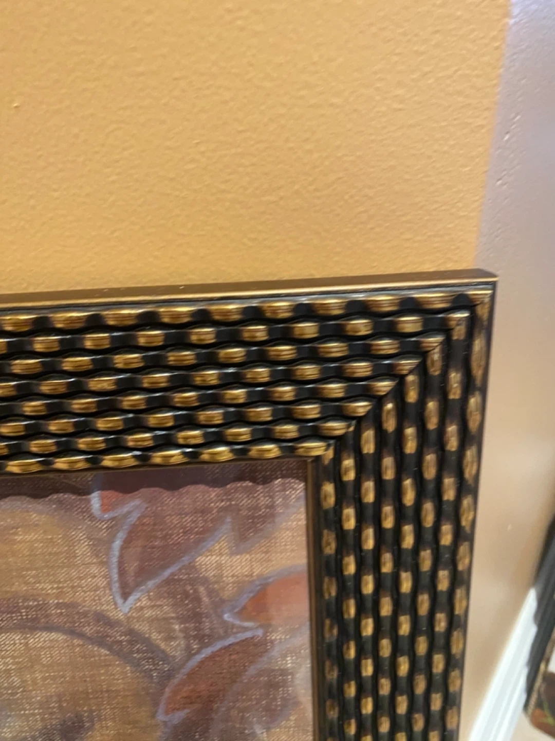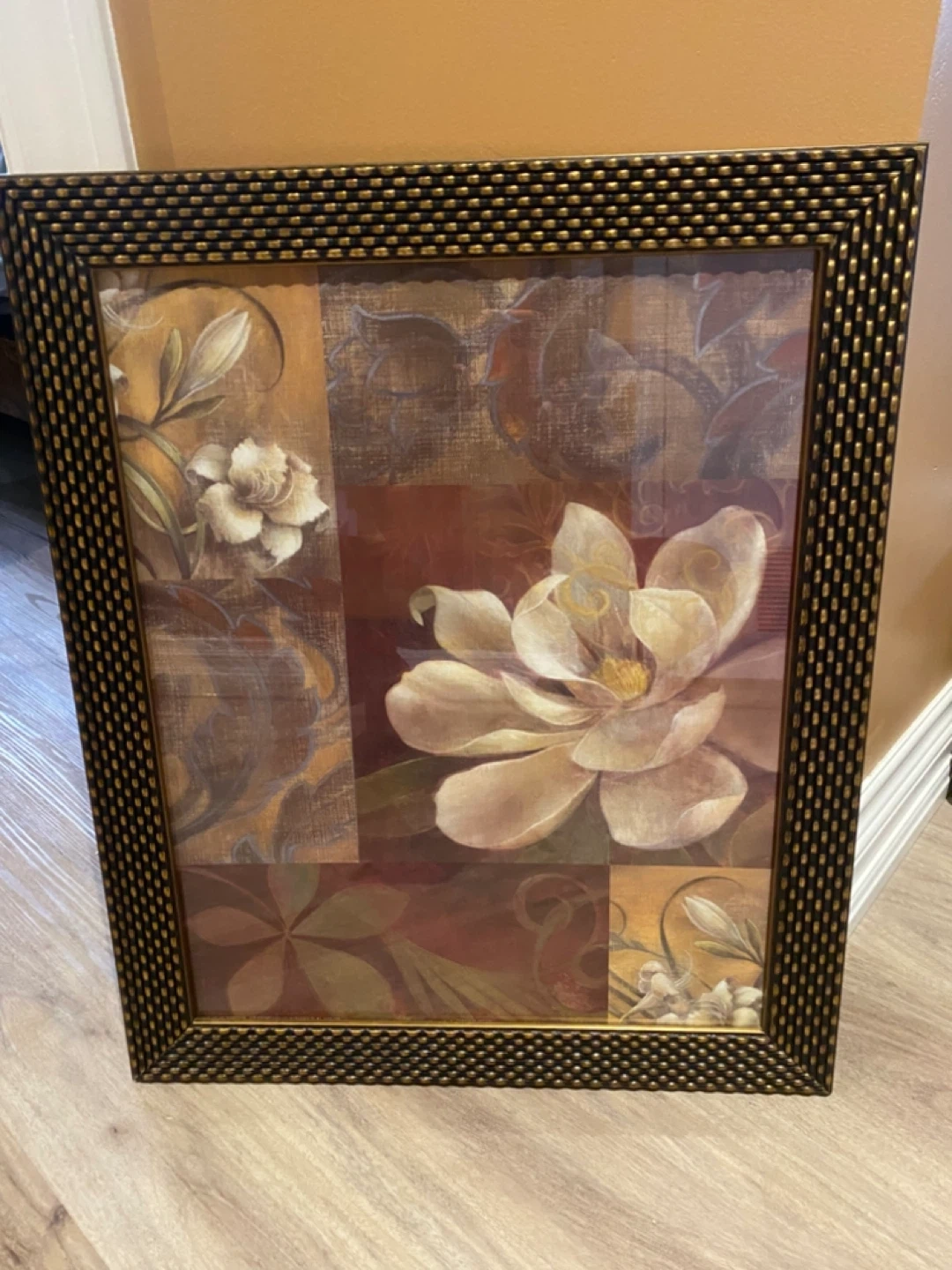 Framed art print featuring a floral design. The frame is black and gold with a textured pattern. Ready to hang with wire.Measures 16x20”