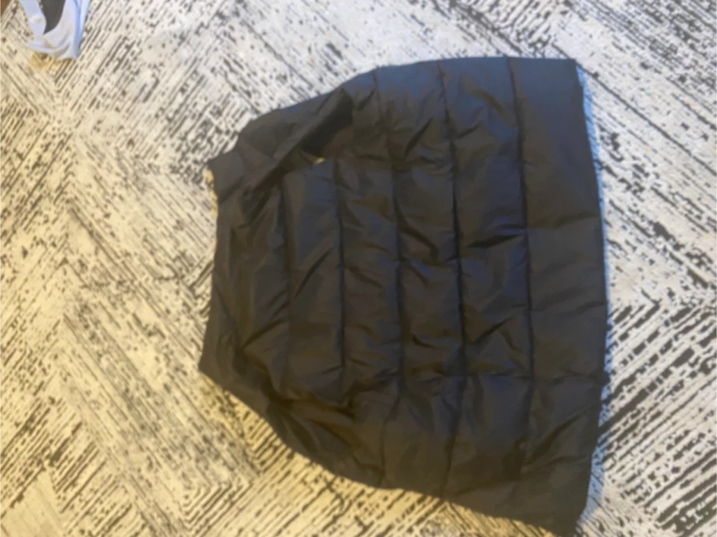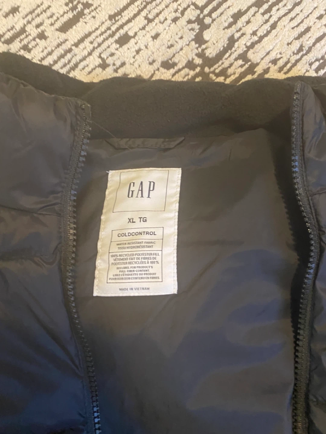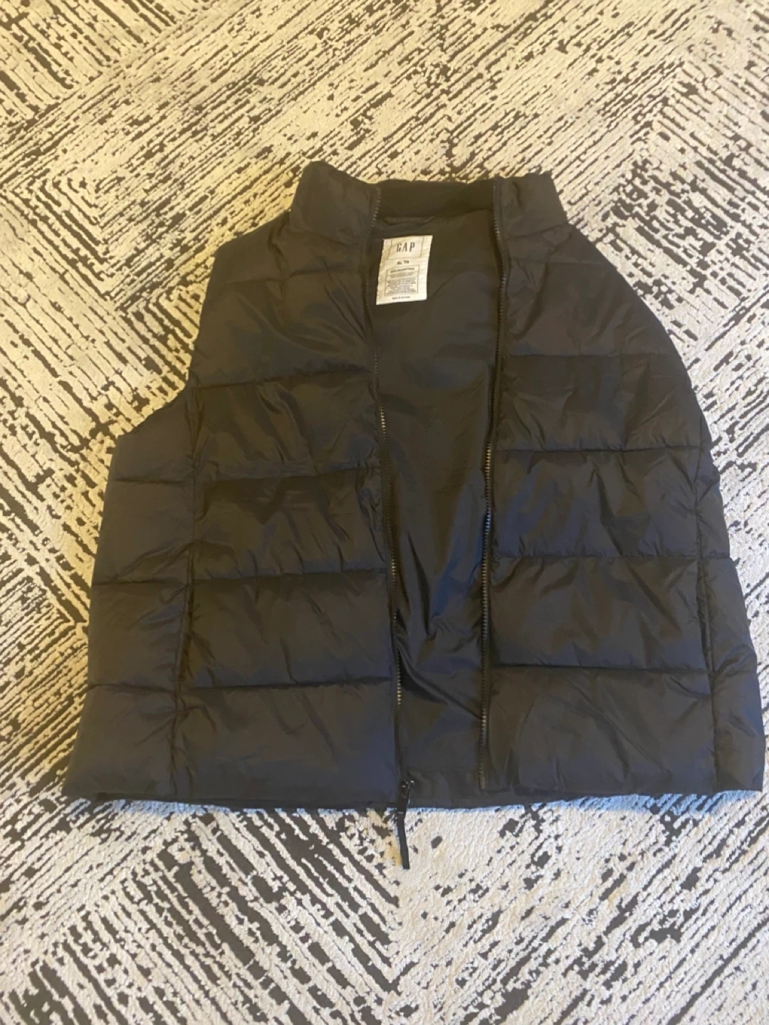 This is a black puffer vest from GAP. It's made with water-resistant fabric and features COLDCONTROL technology. Can fit small
