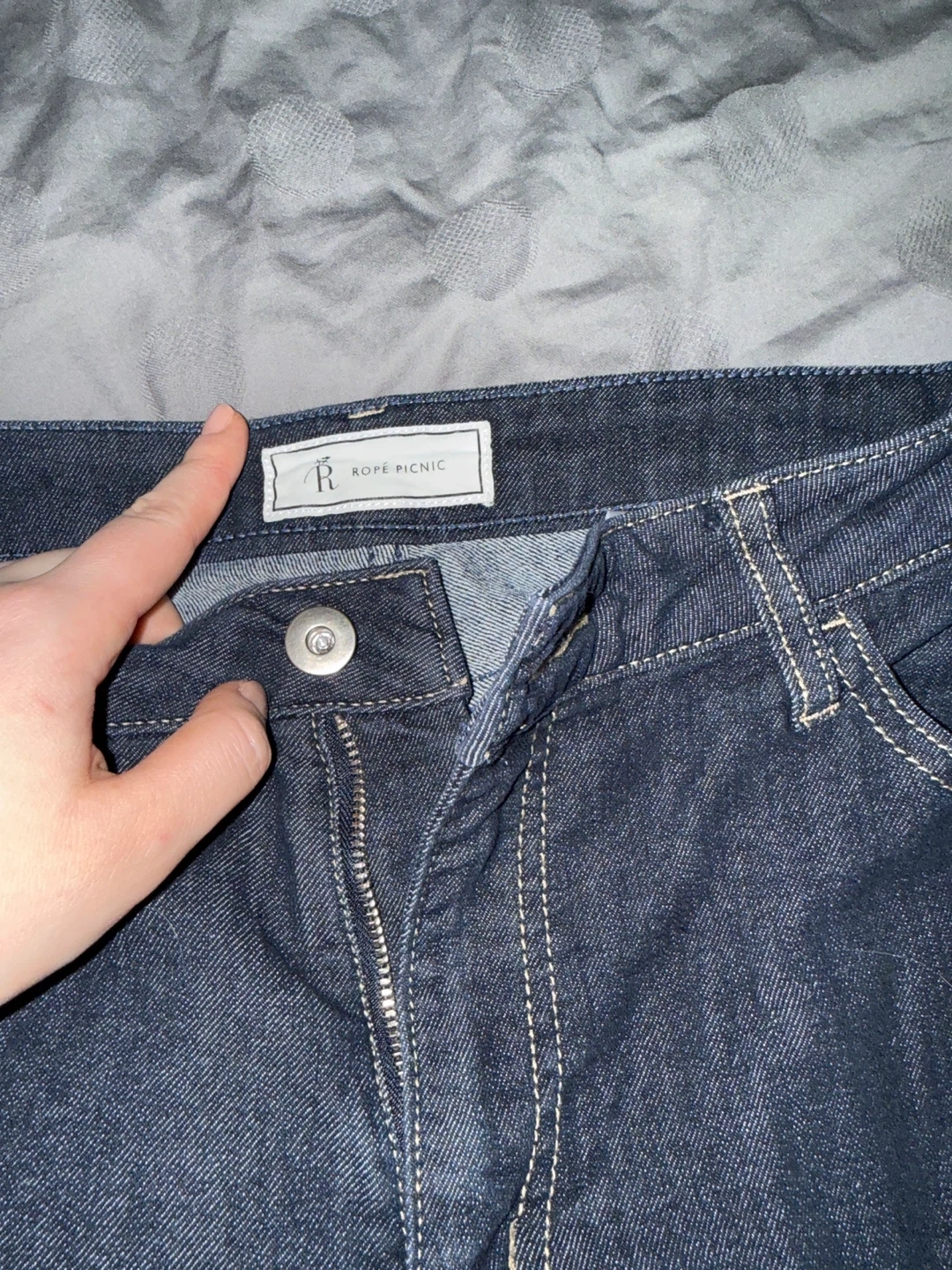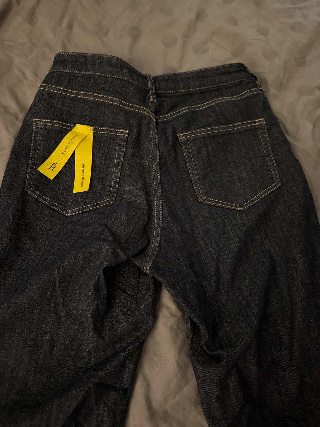 Dark wash denim jeans from Rope Picnic a designer Brand in Japan. These jeans have a flare leg style. Made of cotton material. Has some stretch.