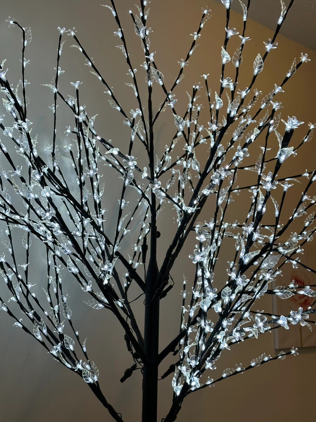 This decorative tree features numerous white LED lights on its branches, creating a lovely ambiance. It's powered by an electrical plug. This illuminated tree is perfect for adding a festive or elegant touch to your home decor indoors.