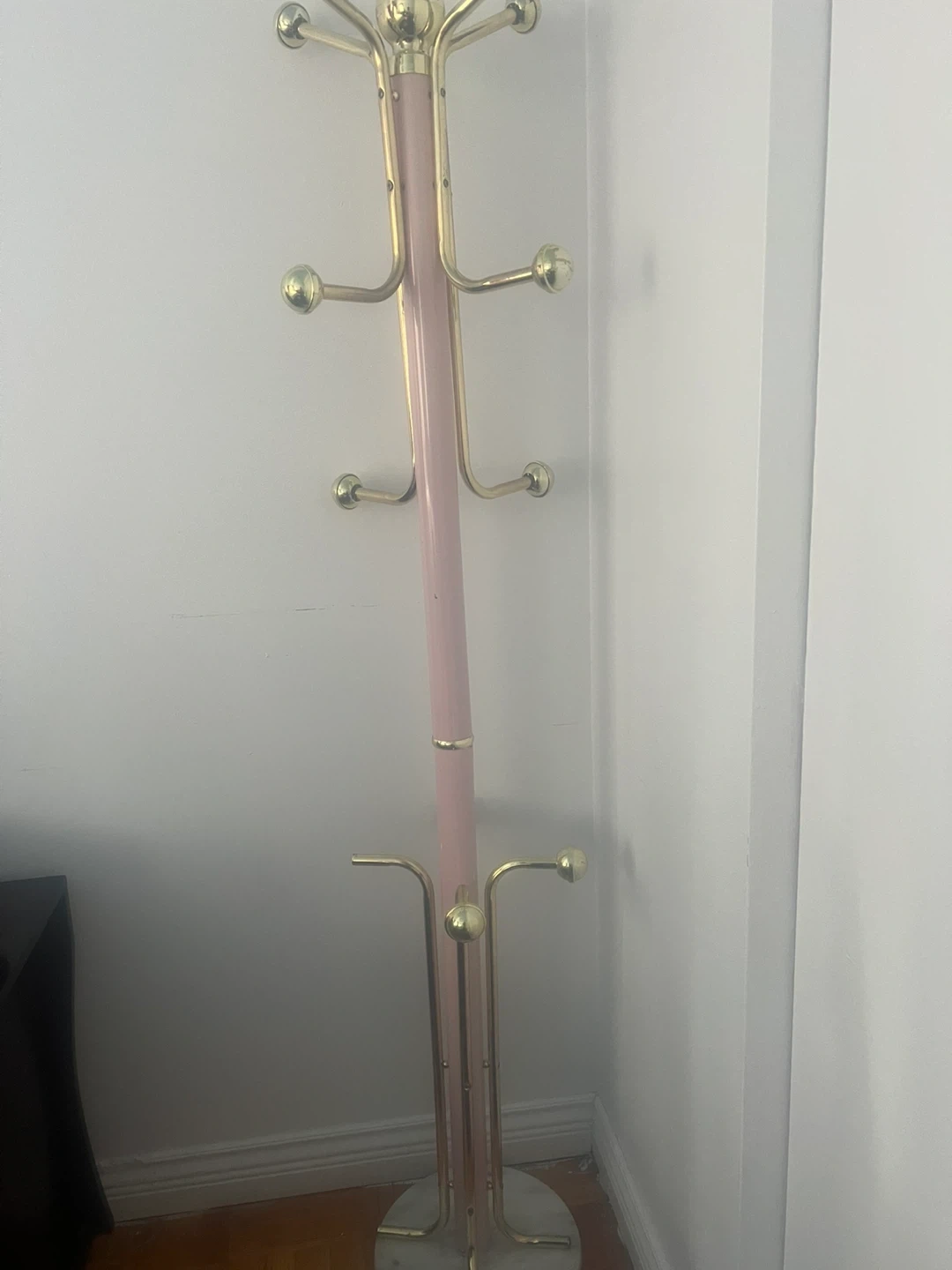 This vintage-style coat rack features a pale pink central pole with multiple gold hooks. It has a marble base for stability. It's handy for keeping coats, hats, and scarves organized.