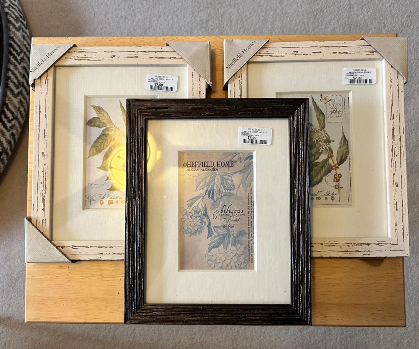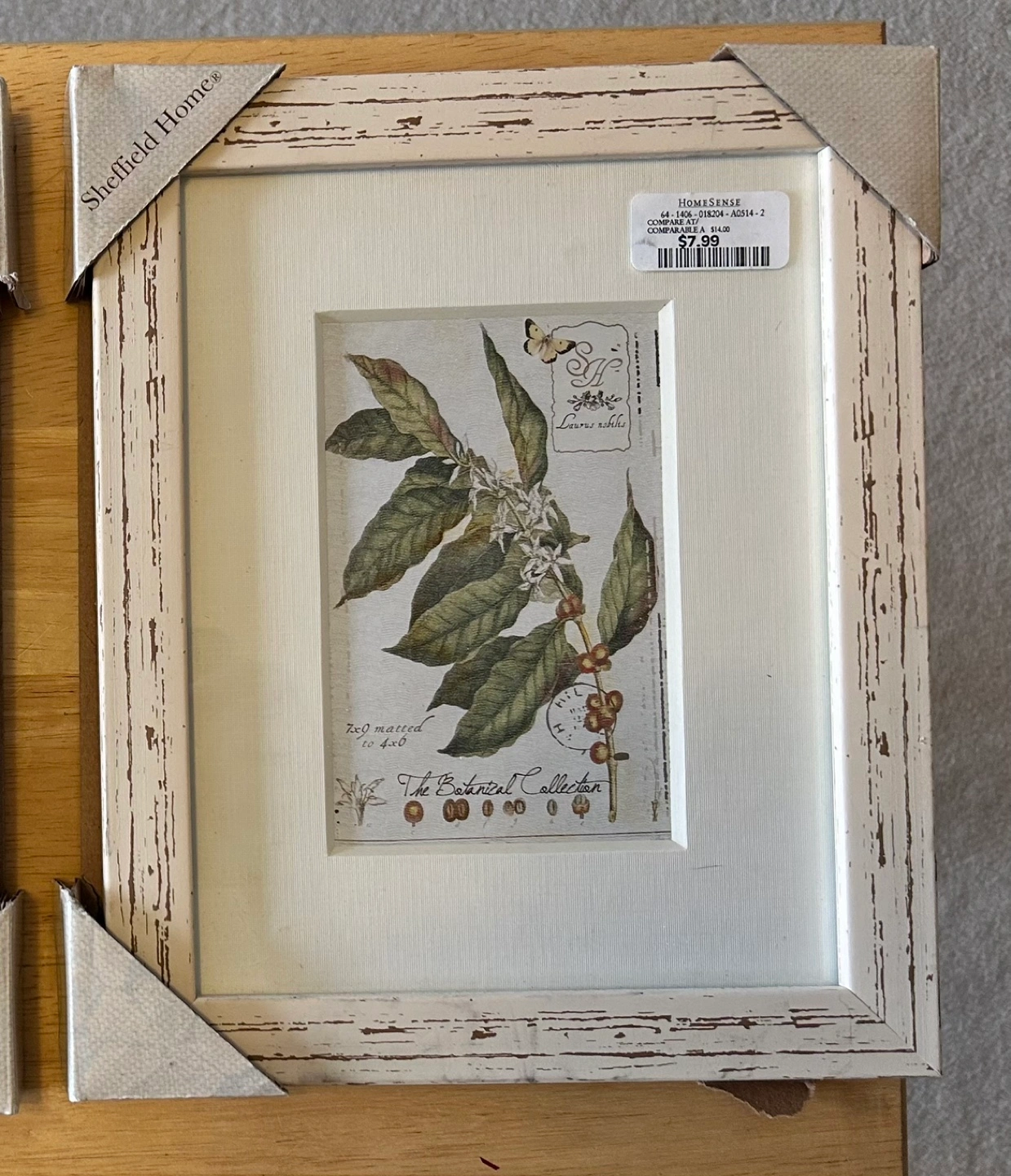 Three framed botanical prints. Two off-white frames with distressed look. One dark brown frame. Images feature coffee plant and hibiscus. 7x9 matted to 8x10. $5 each.
