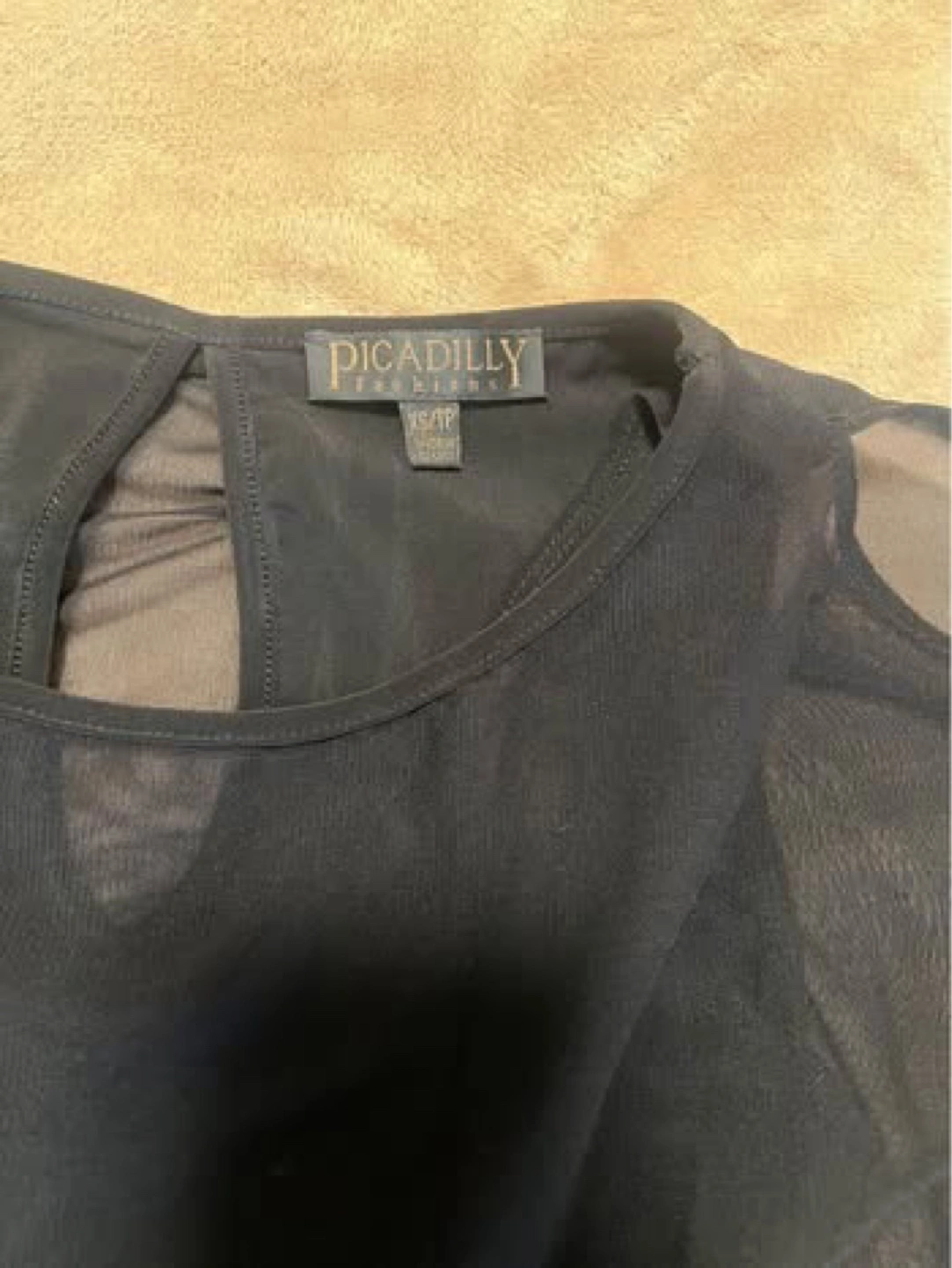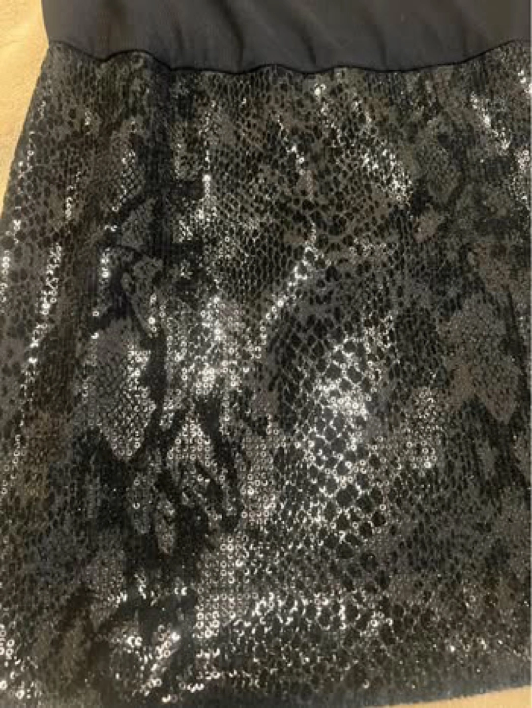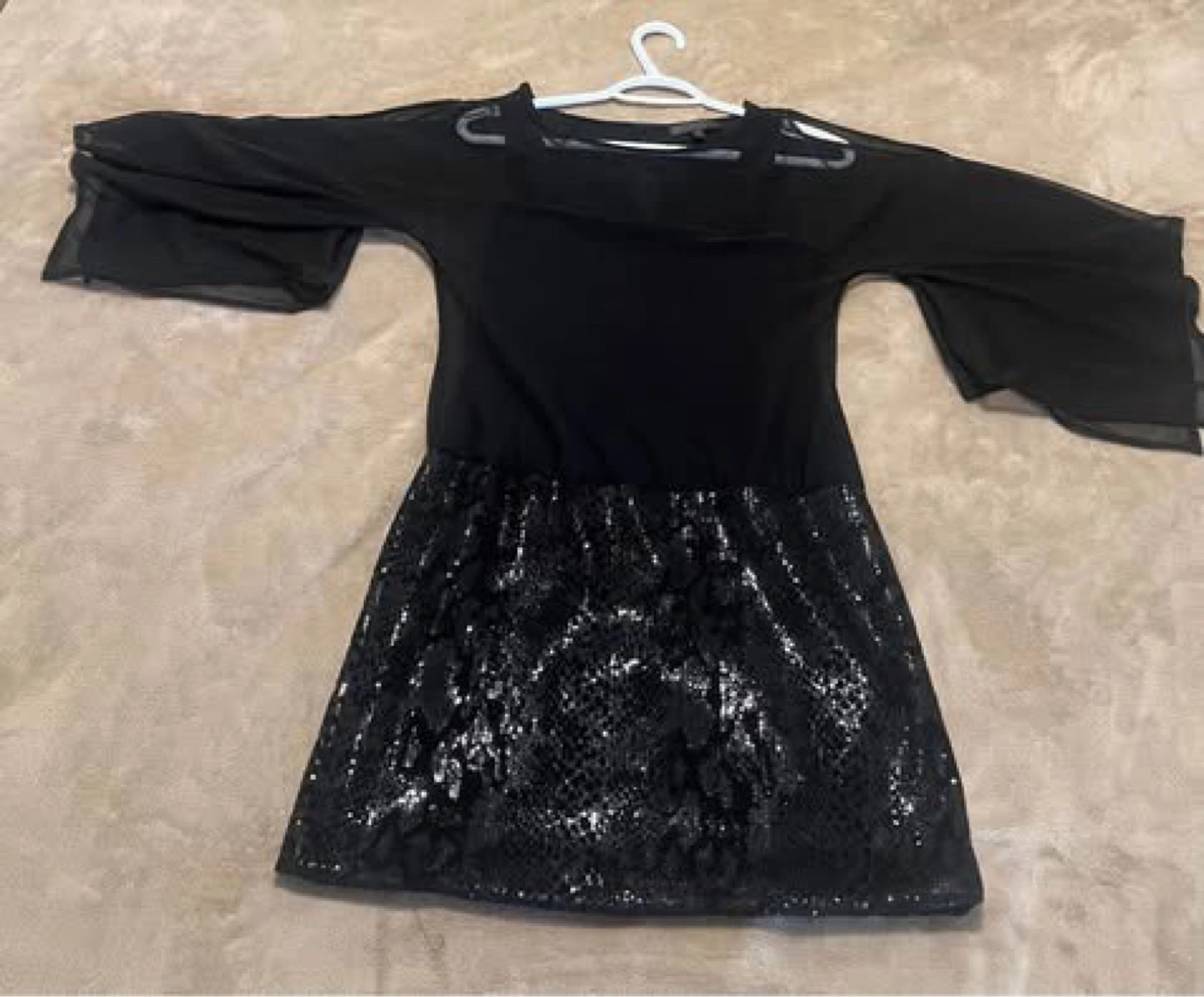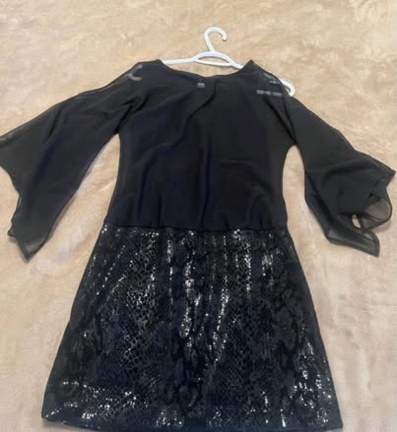 65Black dress with a sequined skirt and sheer sleeves. Size XS/TP. or S-M made in Canada $50 Serious buyers only, please. No free items available. All proceeds will be donated to charity ๐ Check out my other listings for more great deals!