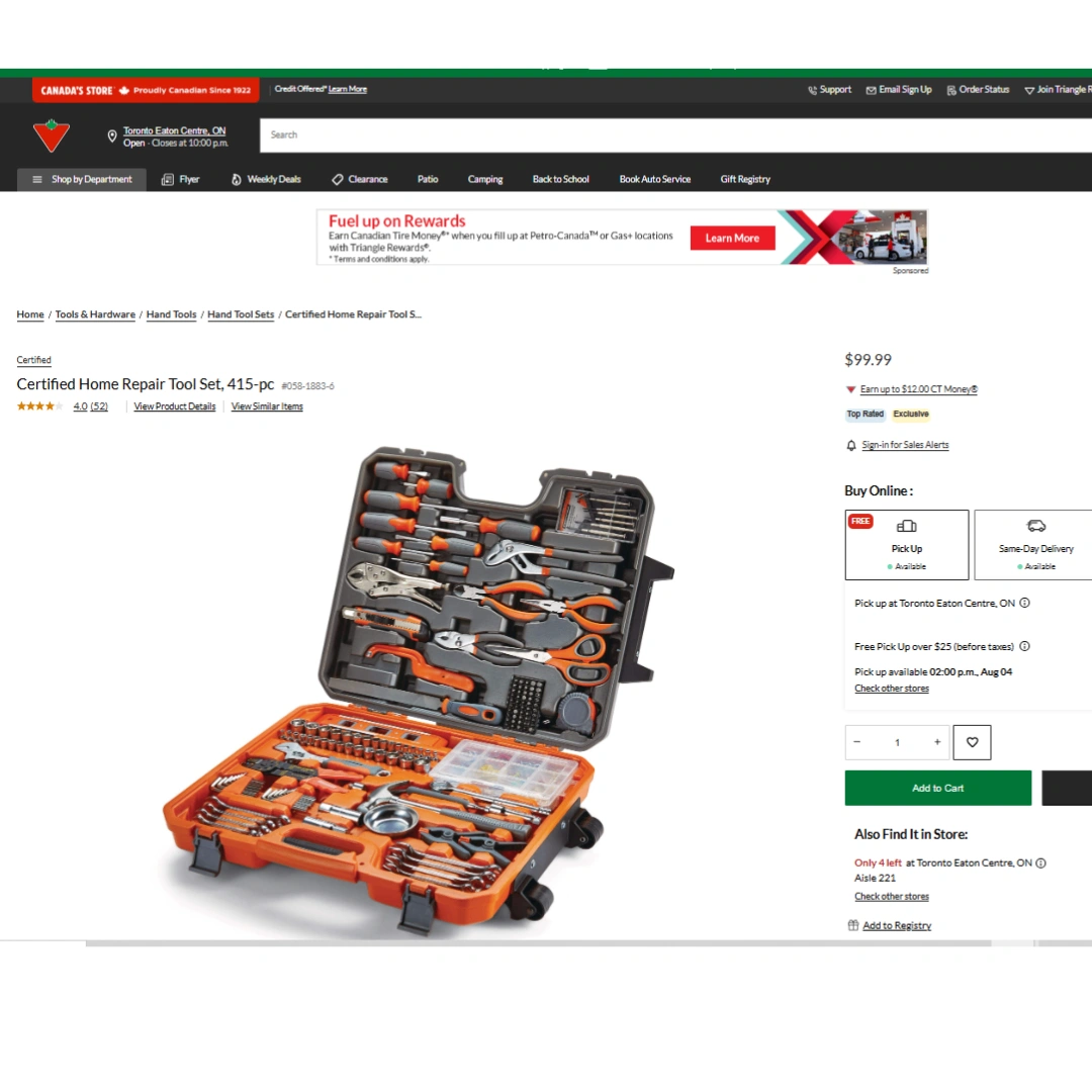 18Pick up location: 390 Queens quay west. I bought this 415-Piece Certified Tool Set $113 from Canadian tire this summer(I have the receipt). It's still sealed, brand new and never opened. I'm moving to Vancouver and I need to return keys to my landlord tonight.