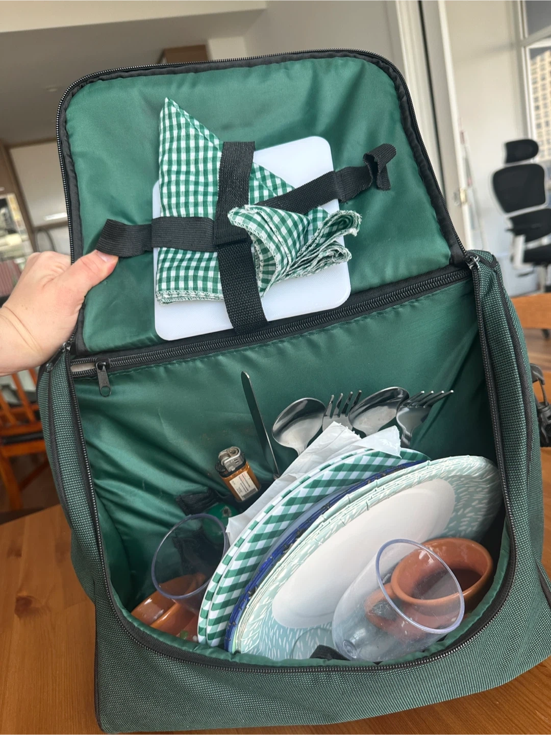 281Picnic basket with full set of cutleries, cups, dishes and plastic glasses. Contain cooler inside. Pick up in Metrotown, Burnaby