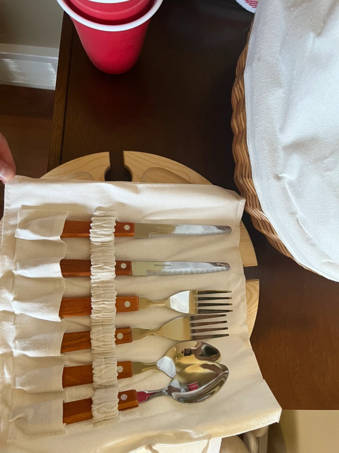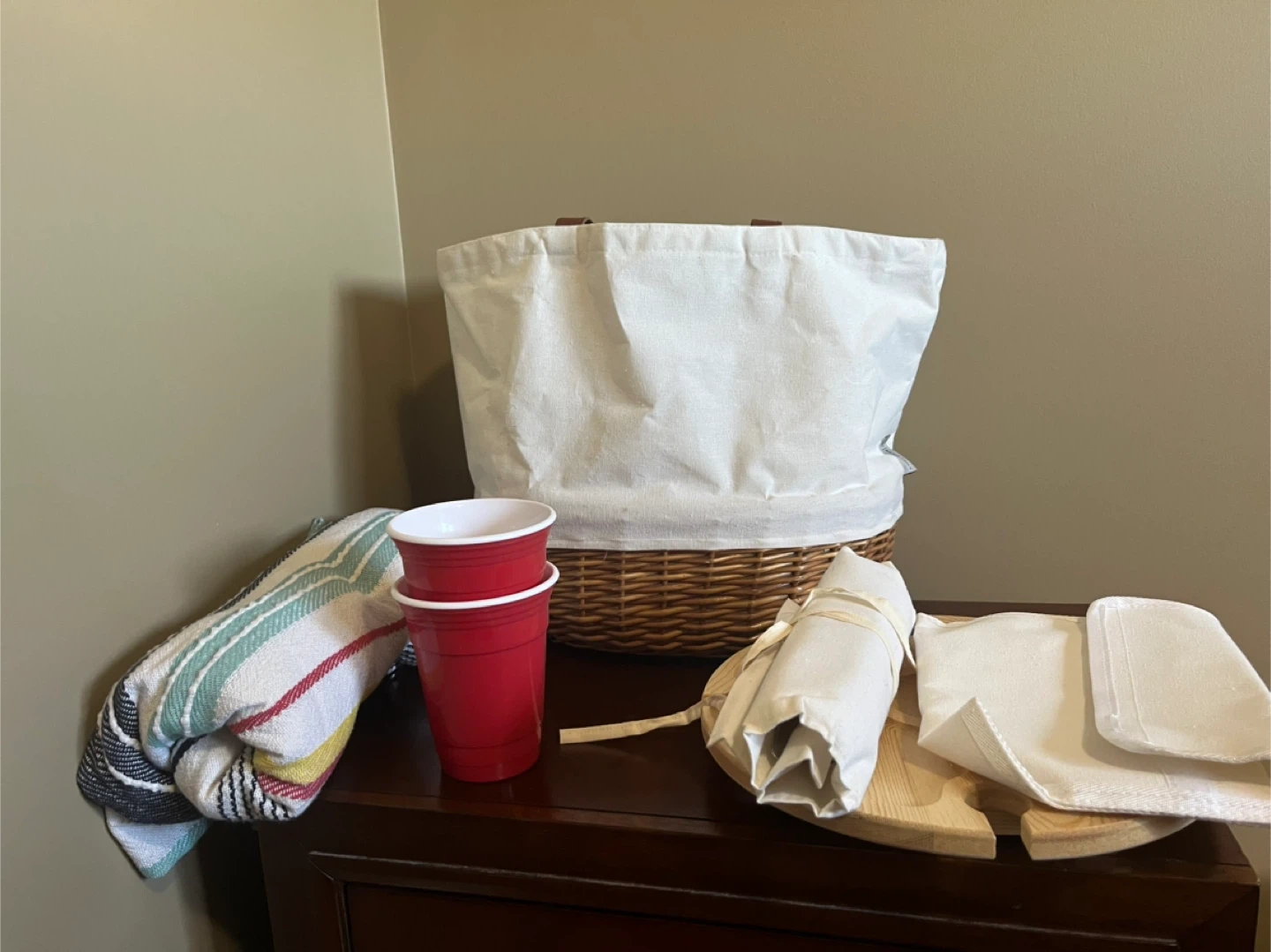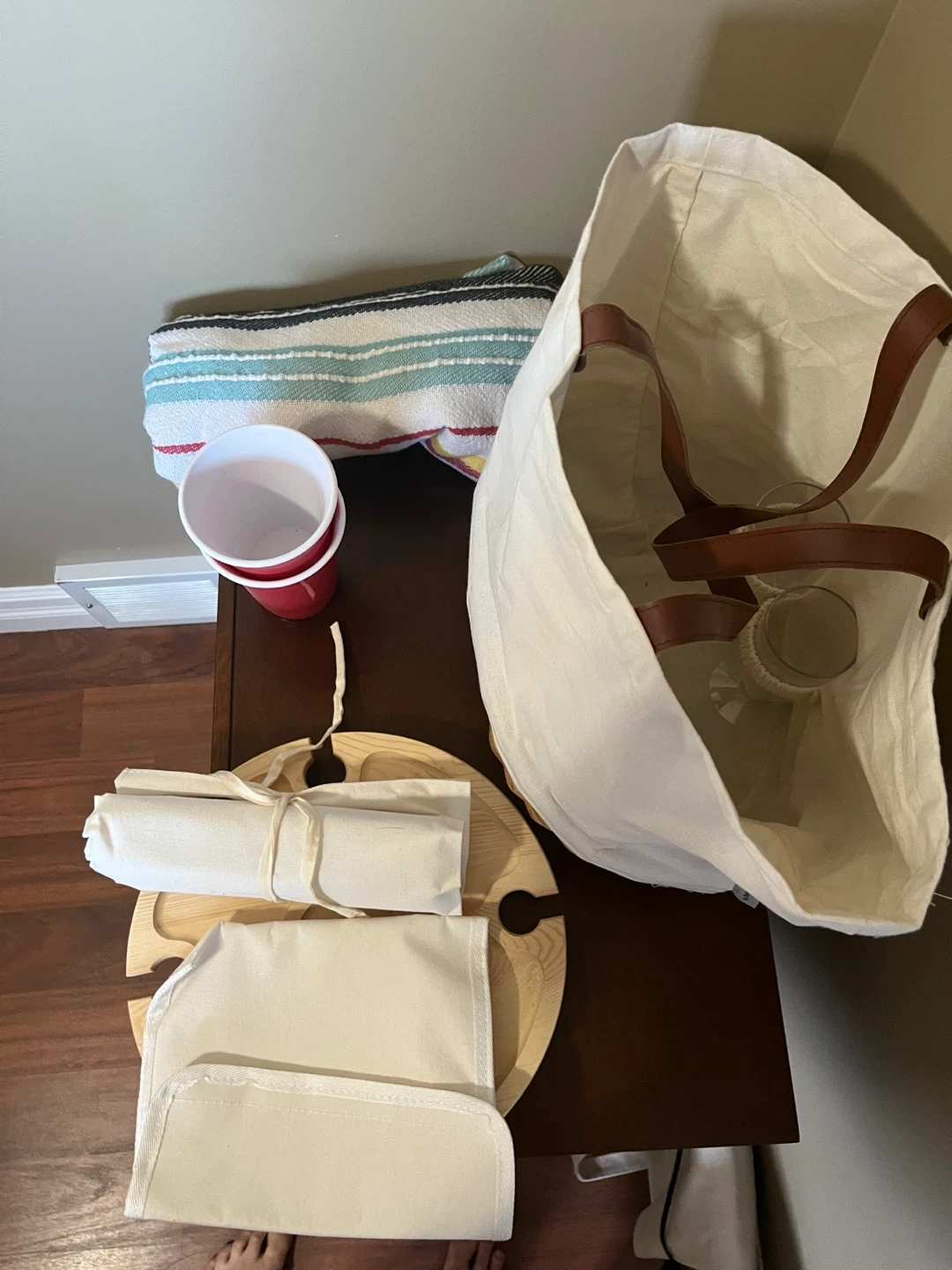 49Selling a picnic basket that comes with all the essentials for a lovely outdoor meal! It includes a tote bag, cups, a blanket, a wooden tray with wine glass holders, and a cutlery set. Never been used.
