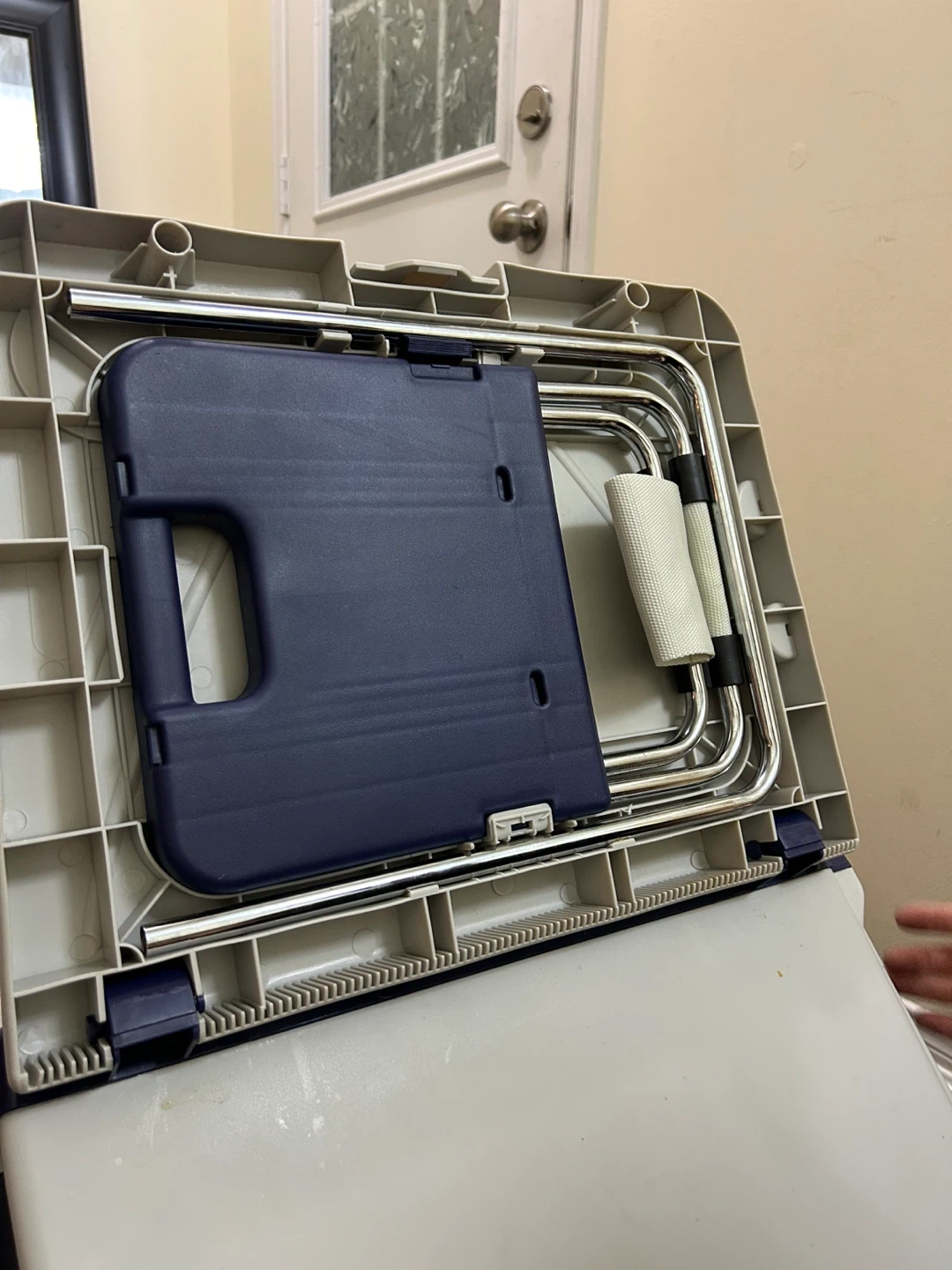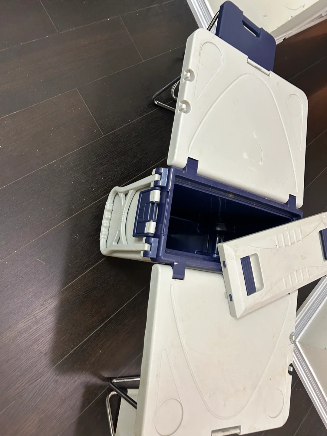 This portable picnic table comes with a built-in cooler and stools. It's perfect for outdoor gatherings, camping, or picnics in the park. The table folds up neatly into a compact case with wheels for easy transport. It's in great condition and ready for your next adventure