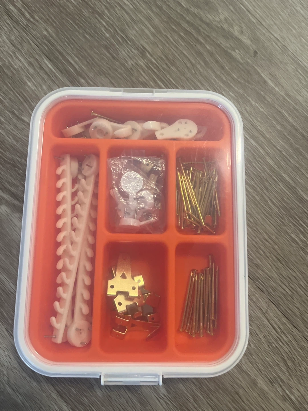 190Picture hanging kit with various hooks and nails in a divided container. Great for organizing and hanging up your favourite photos and art!