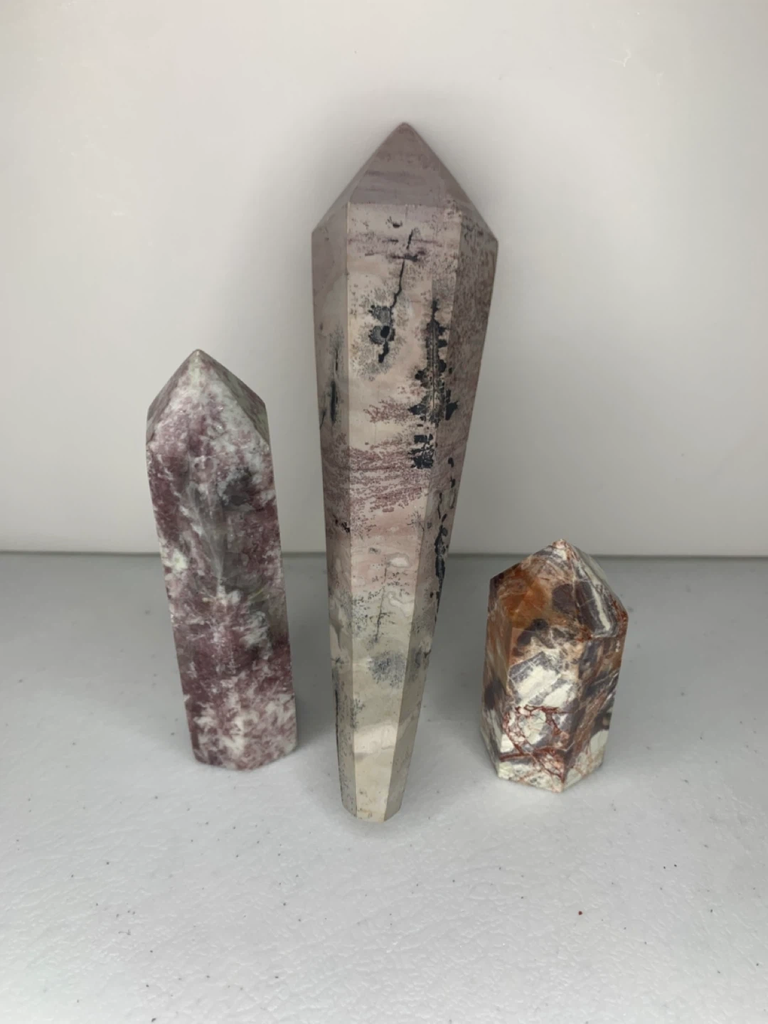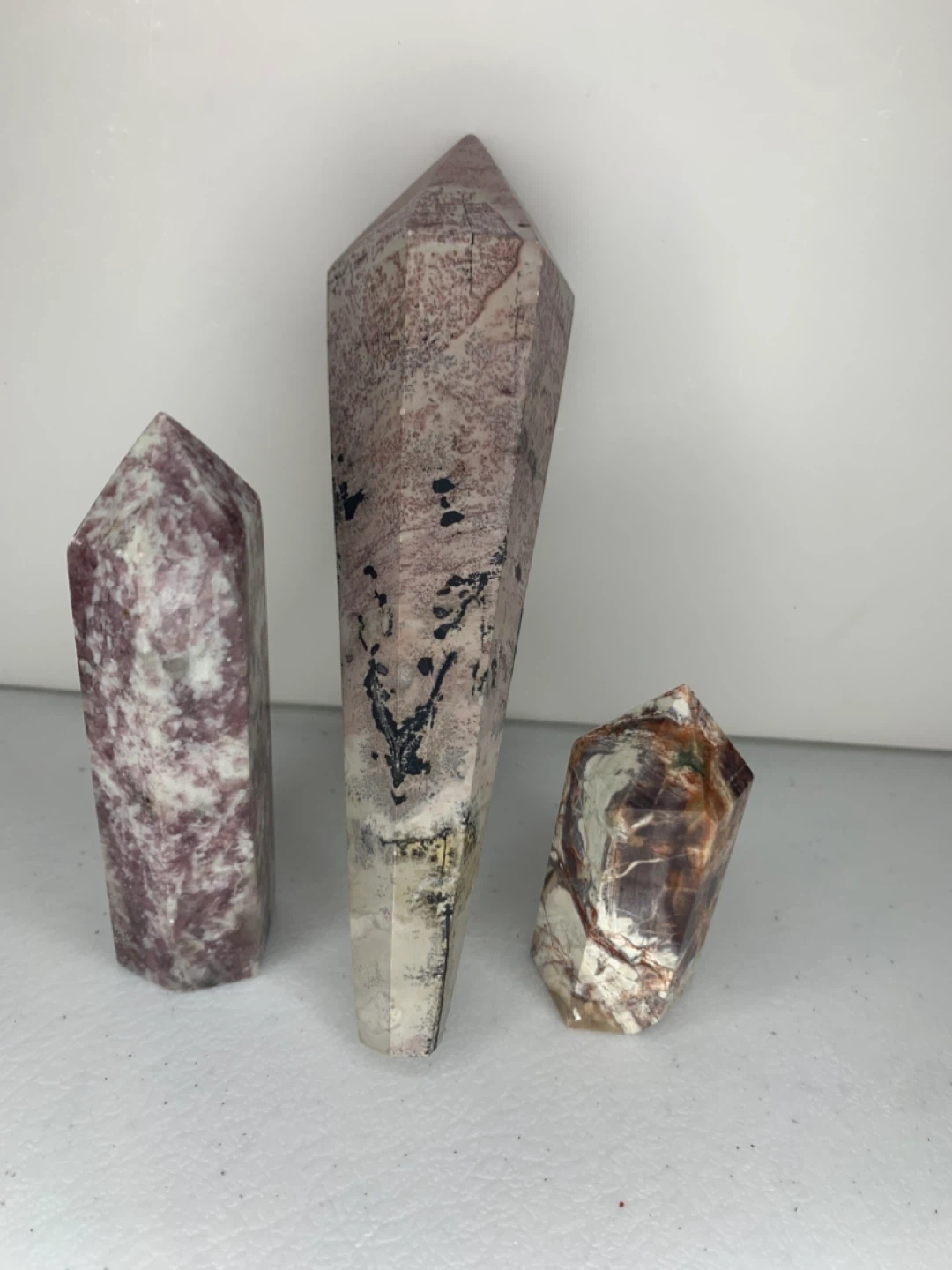 Selling a set of 3 unique crystal towers! They're in great condition and would look lovely in any space. The colours are a mix of pink, white, and brown with interesting patterns
