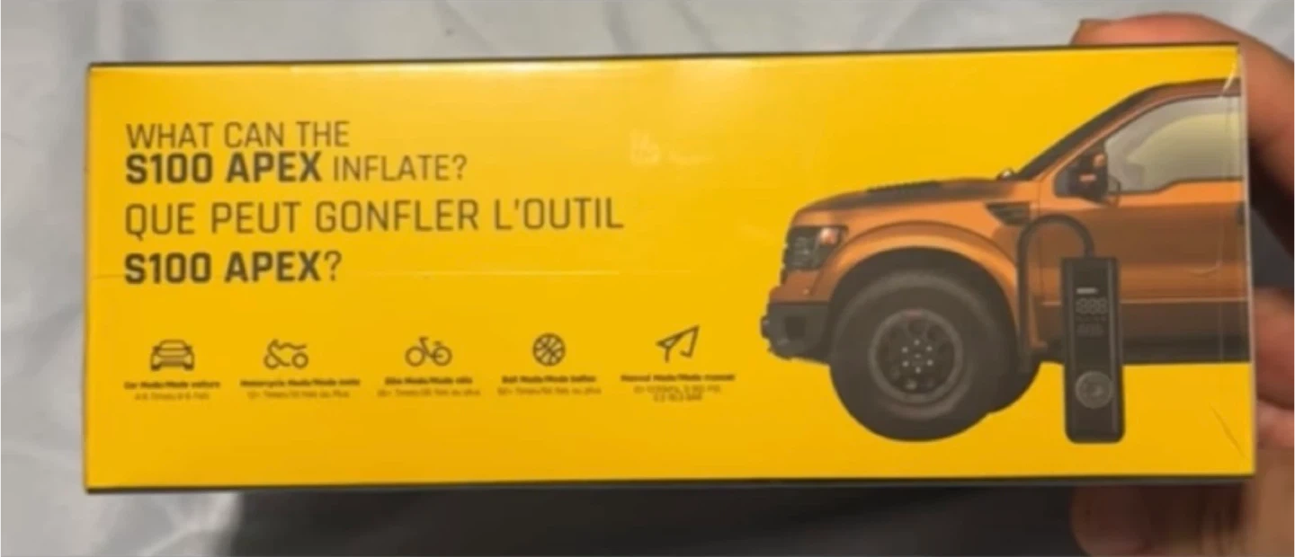 This is the Fanttik S100 APEX portable air inflator. It comes with a USB charging cable, air tube, needle valve adapter, and Schrader valve adapter. Pressure range is 0-150 PSI.