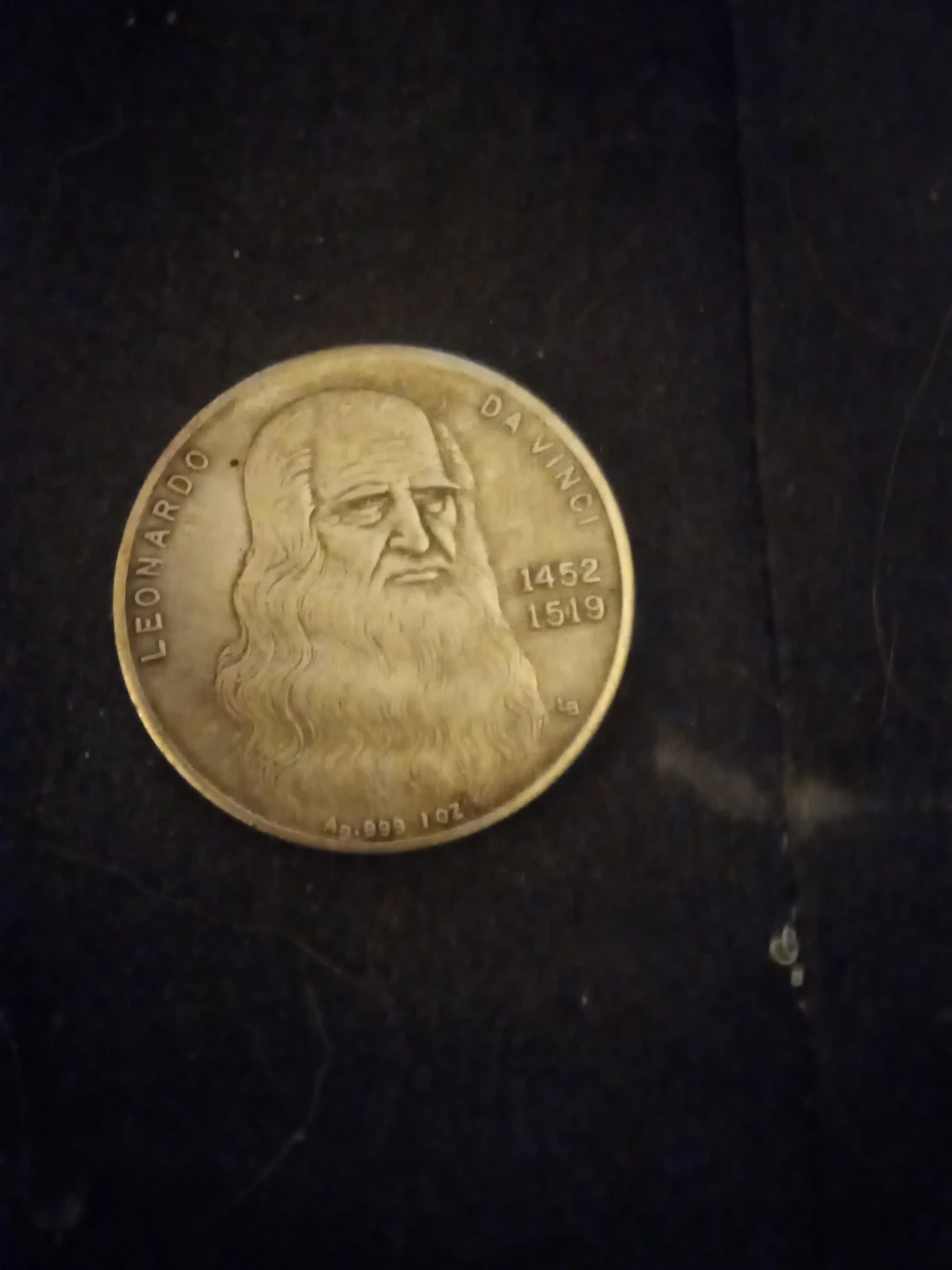 This is a commemorative coin featuring Leonardo da Vinci. The obverse shows his portrait with 'LEONARDO DA VINCI 1452 1519' and '49.999 1OZ'. The reverse depicts a nude figure. It's a nice piece for collectors.