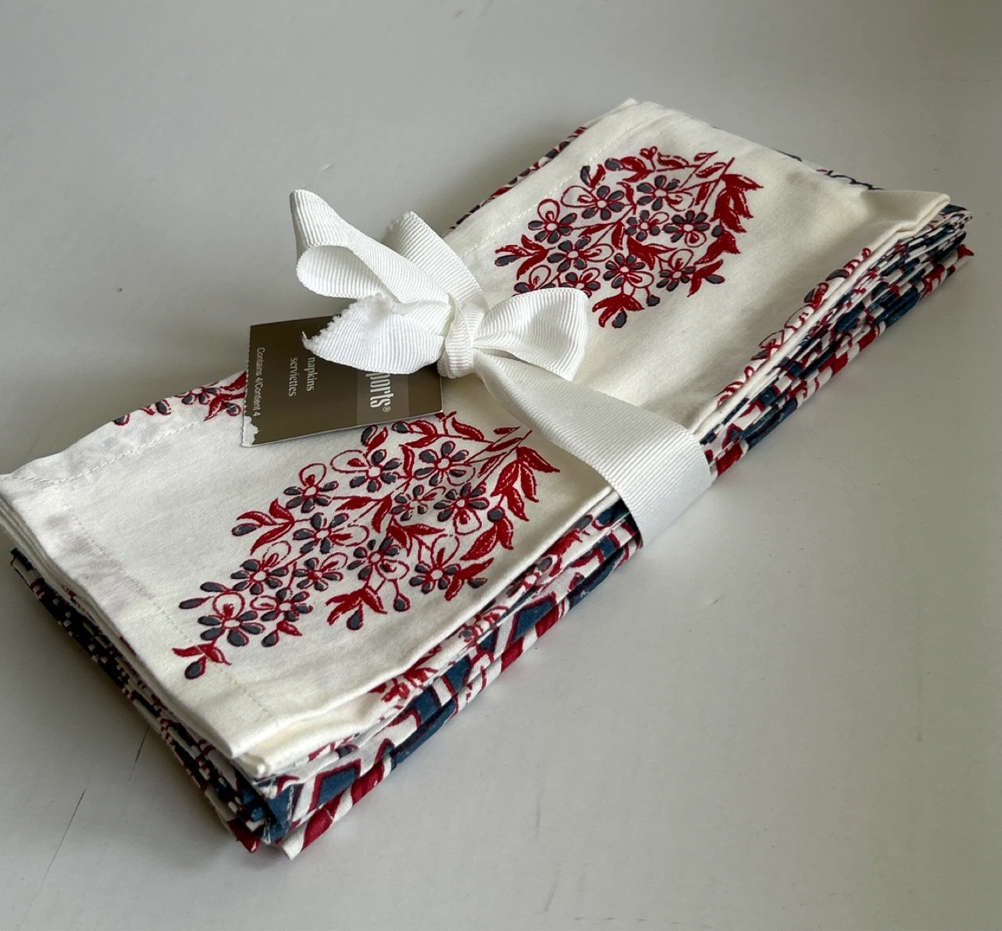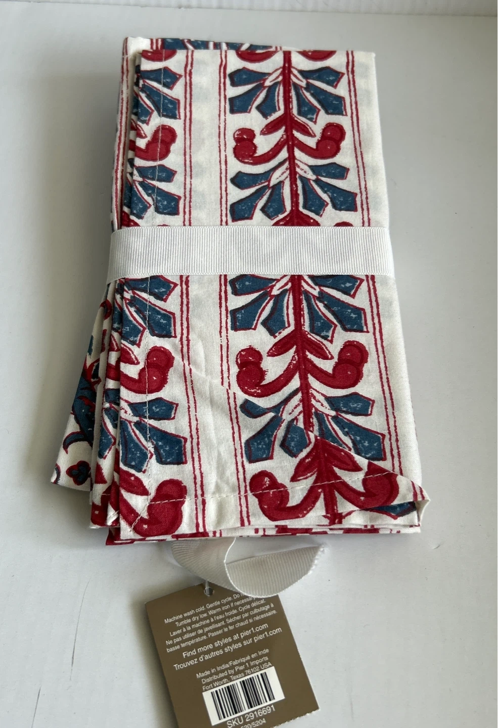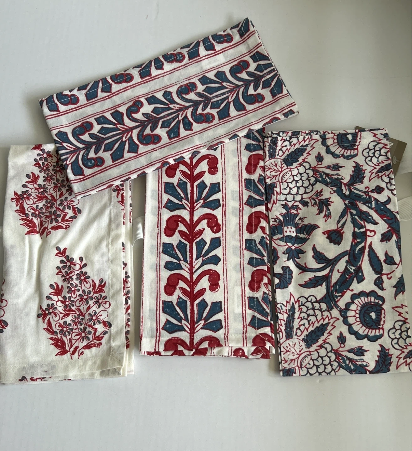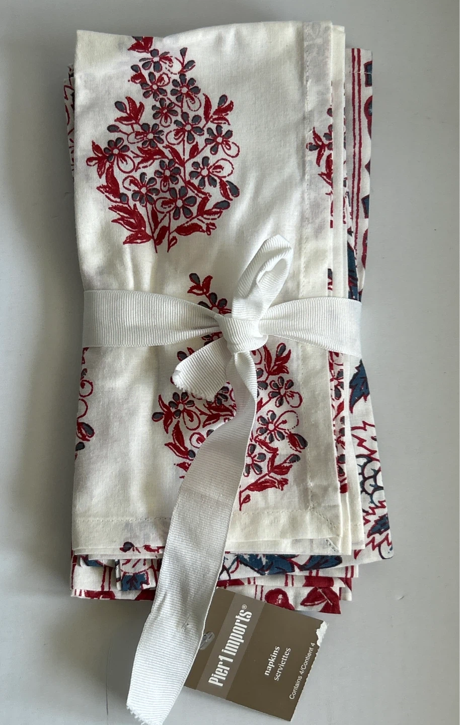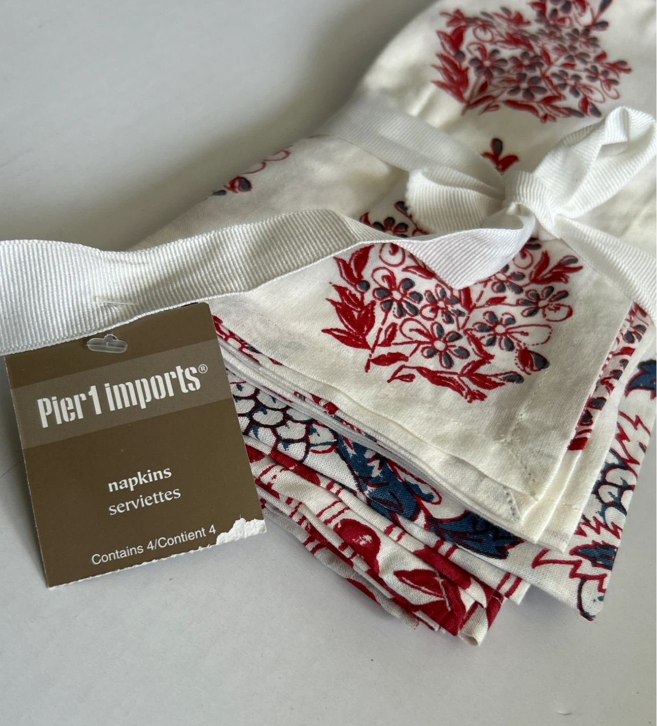 Selling a set of brand new - 4 pcs. - Pier 1 Imports table napkins. They feature a lovely floral pattern in red and blue tones on a white background. Each piece have their own unique design. Perfect for adding a touch of elegance to your dining table! They are made of good quality fabric. Smoke/Pet free home. Cash & Pick Up only.