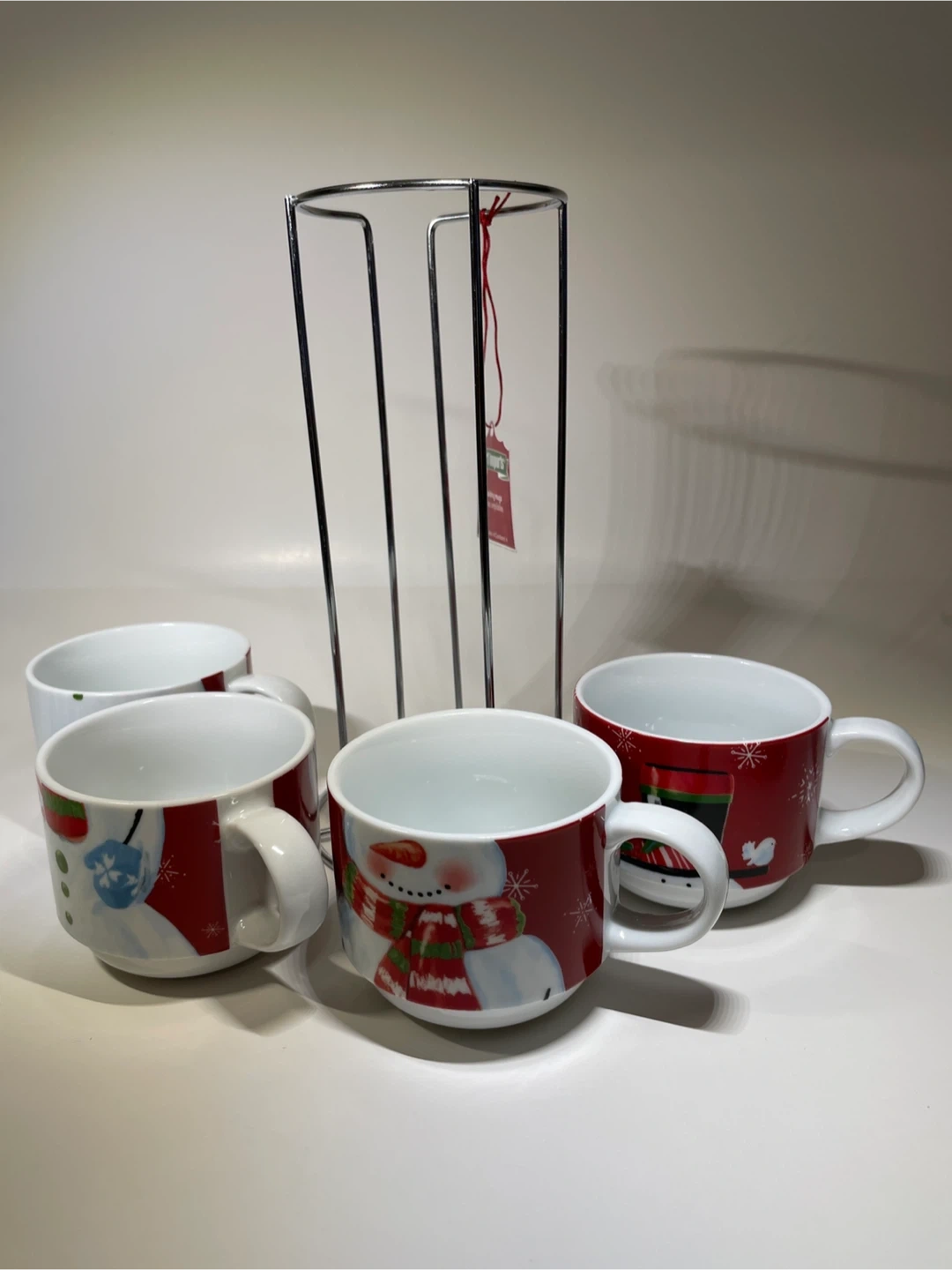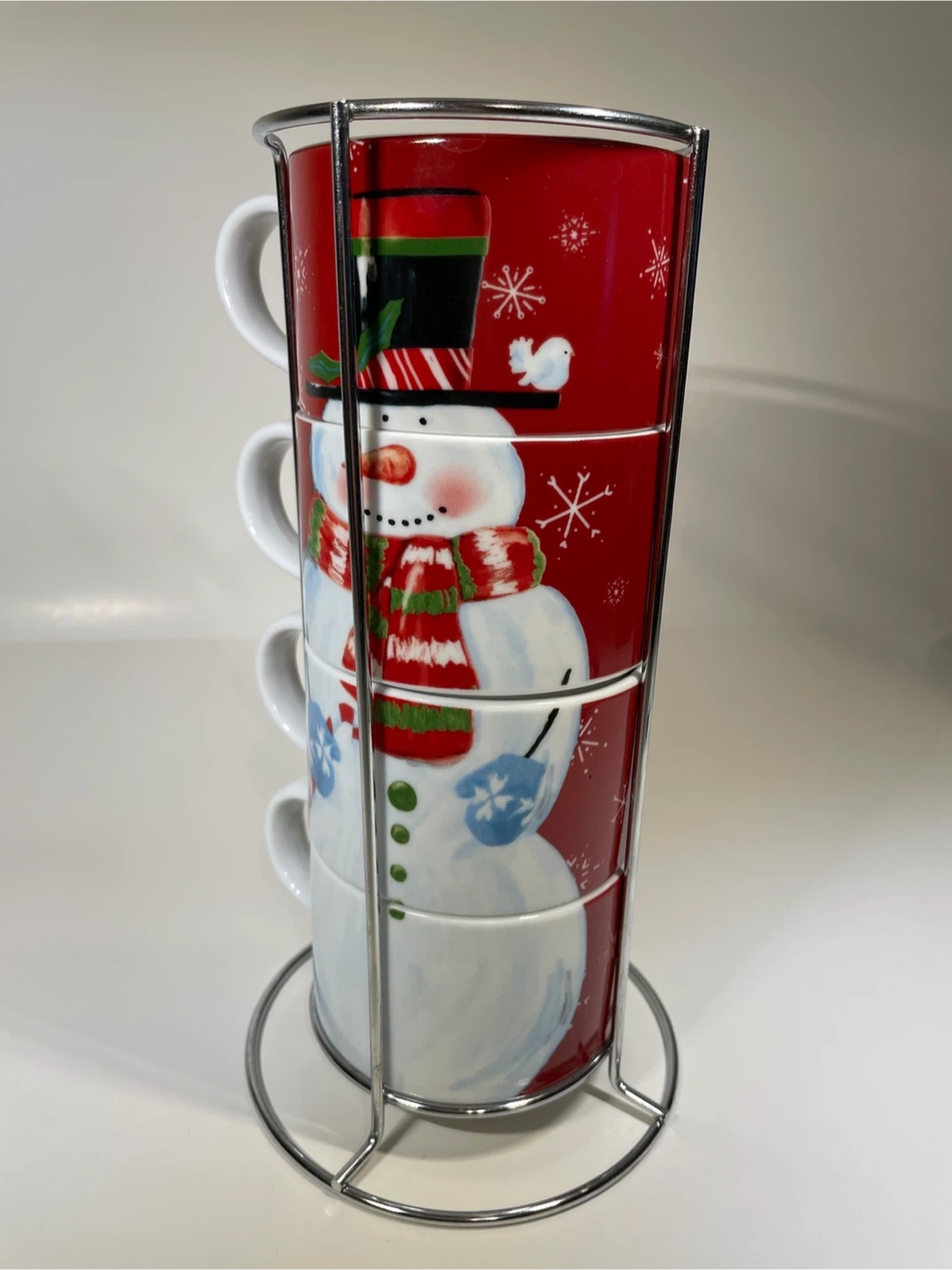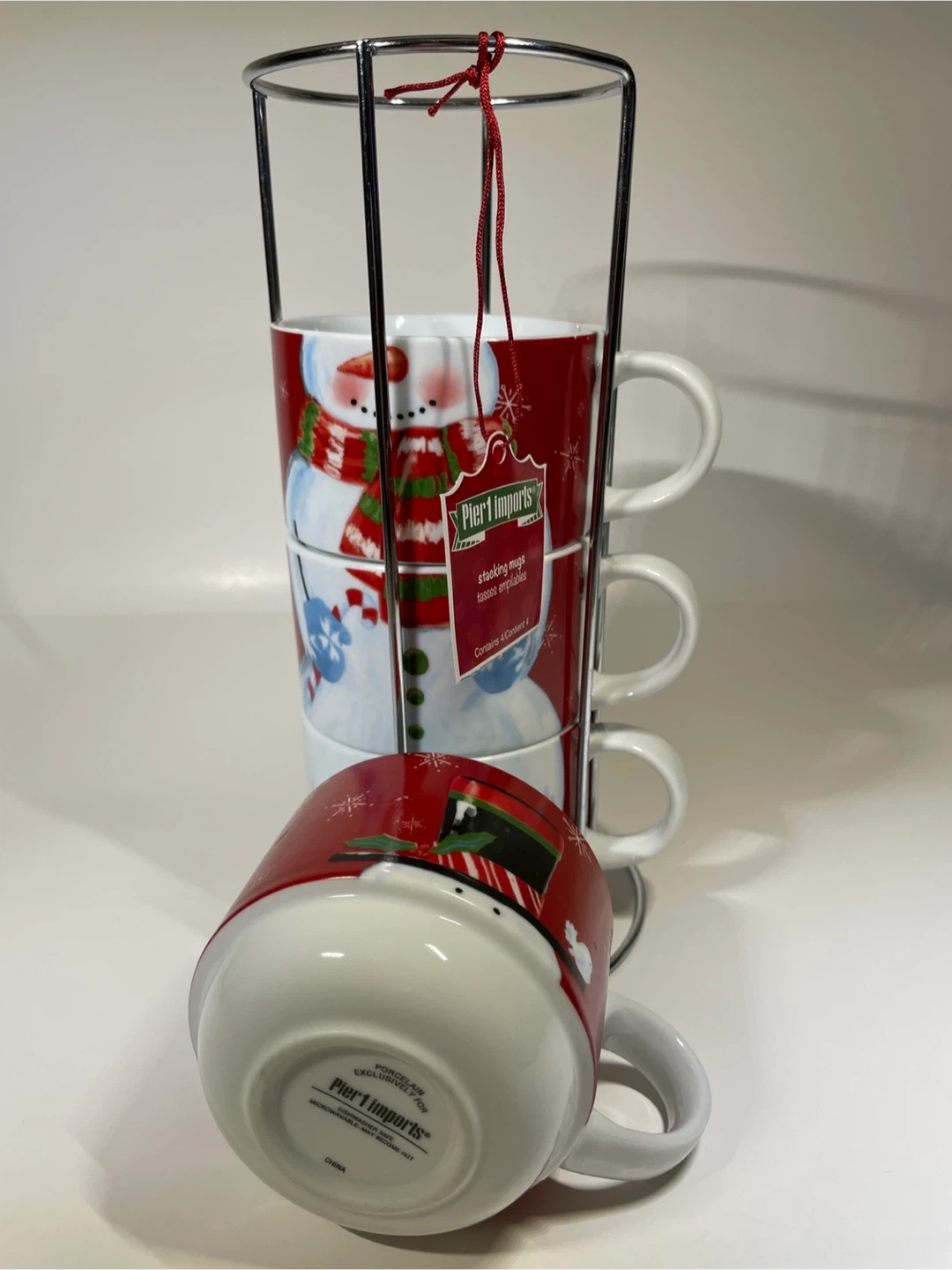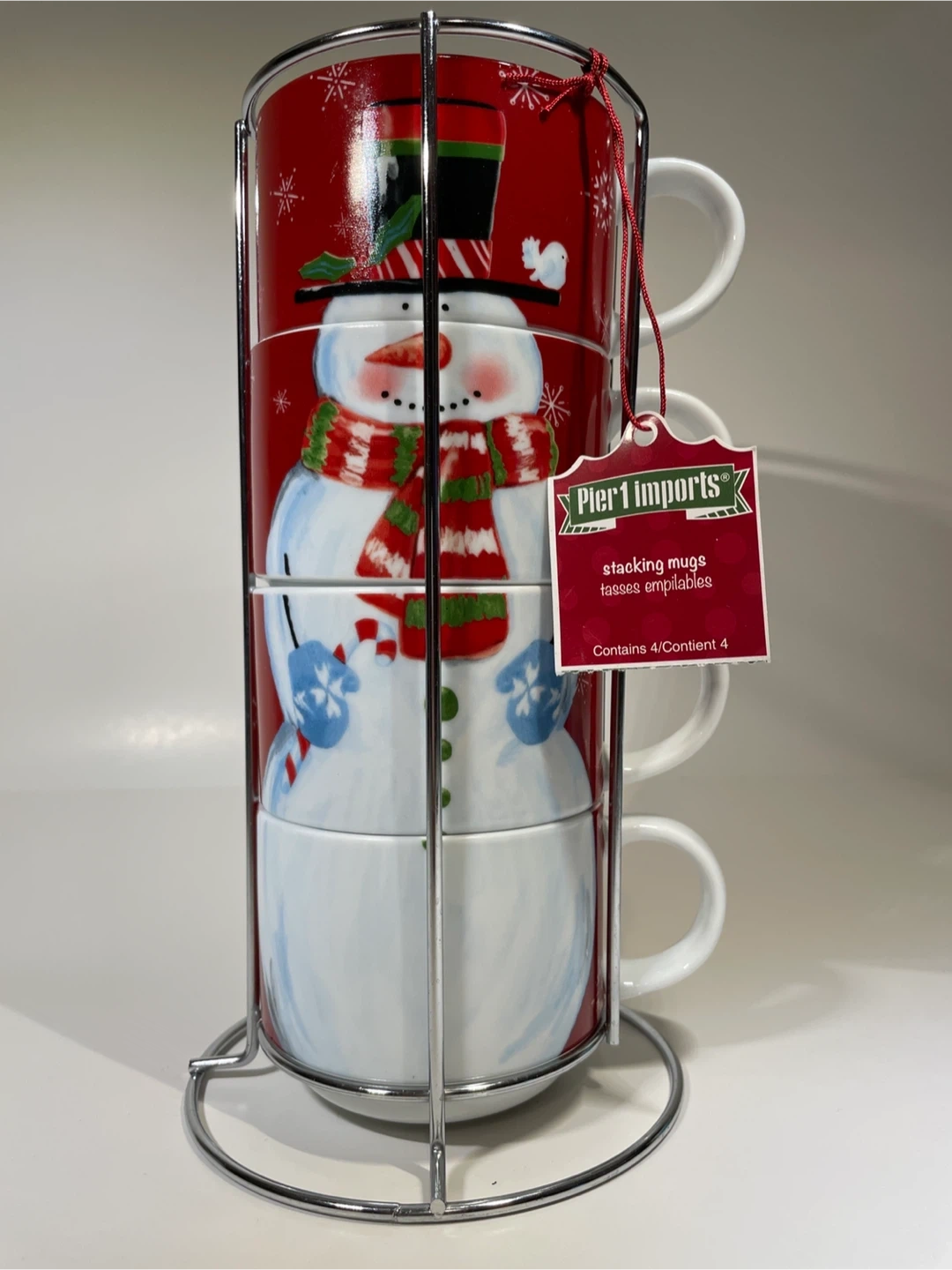 5Brand New! Here's a set of super cute Pier 1 Imports stacking mugs, perfect for winter! They come with a handy stand for easy storage and display. Each mug features a different part of a snowman design when stacked. Contains 4 mugs.