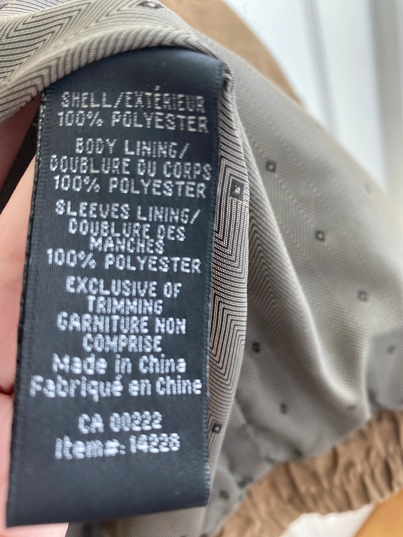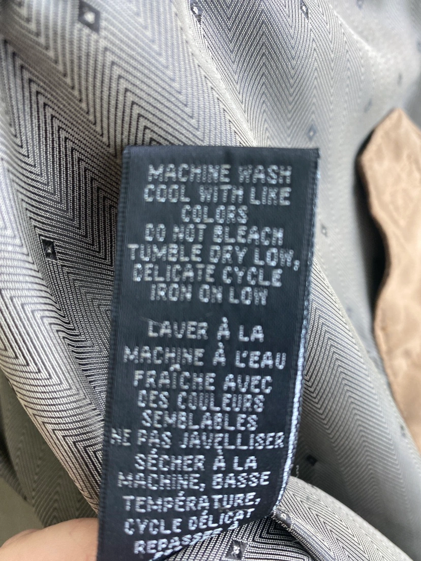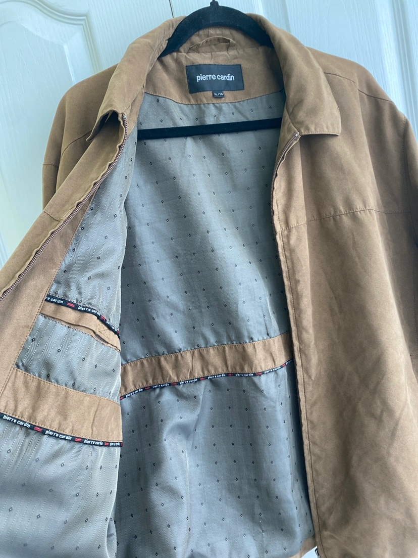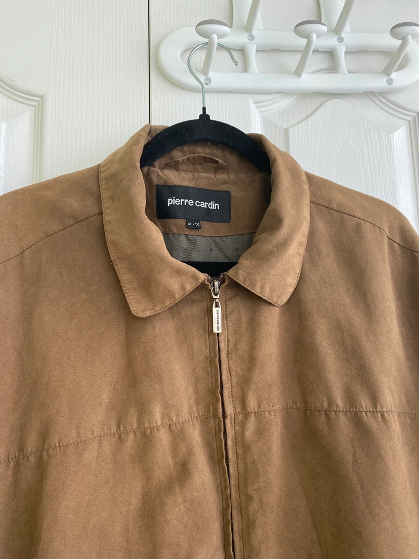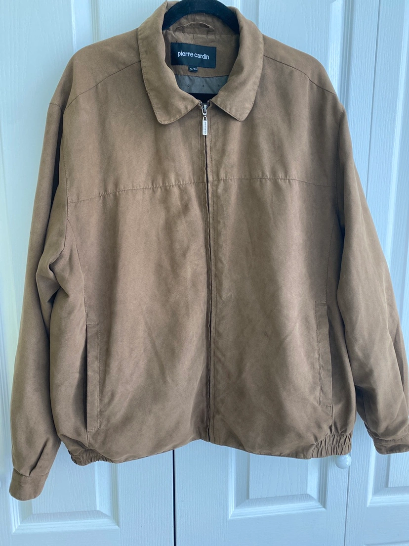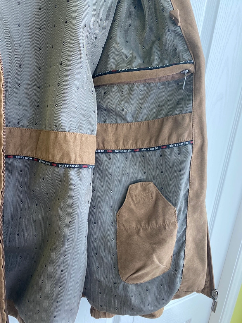114Men's brown suede jacket with zipper closure. Features a zippered pocket on the inside and two pockets on the outside. Made by Pierre Cardin. Size XL/TG. Machine washable. Excellent condition.