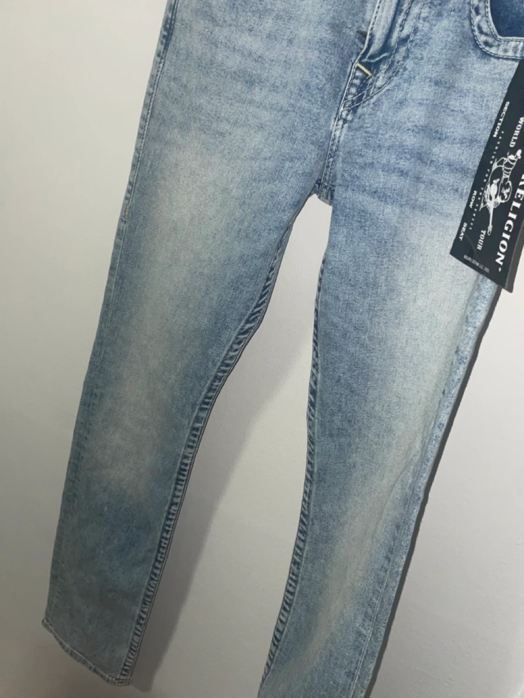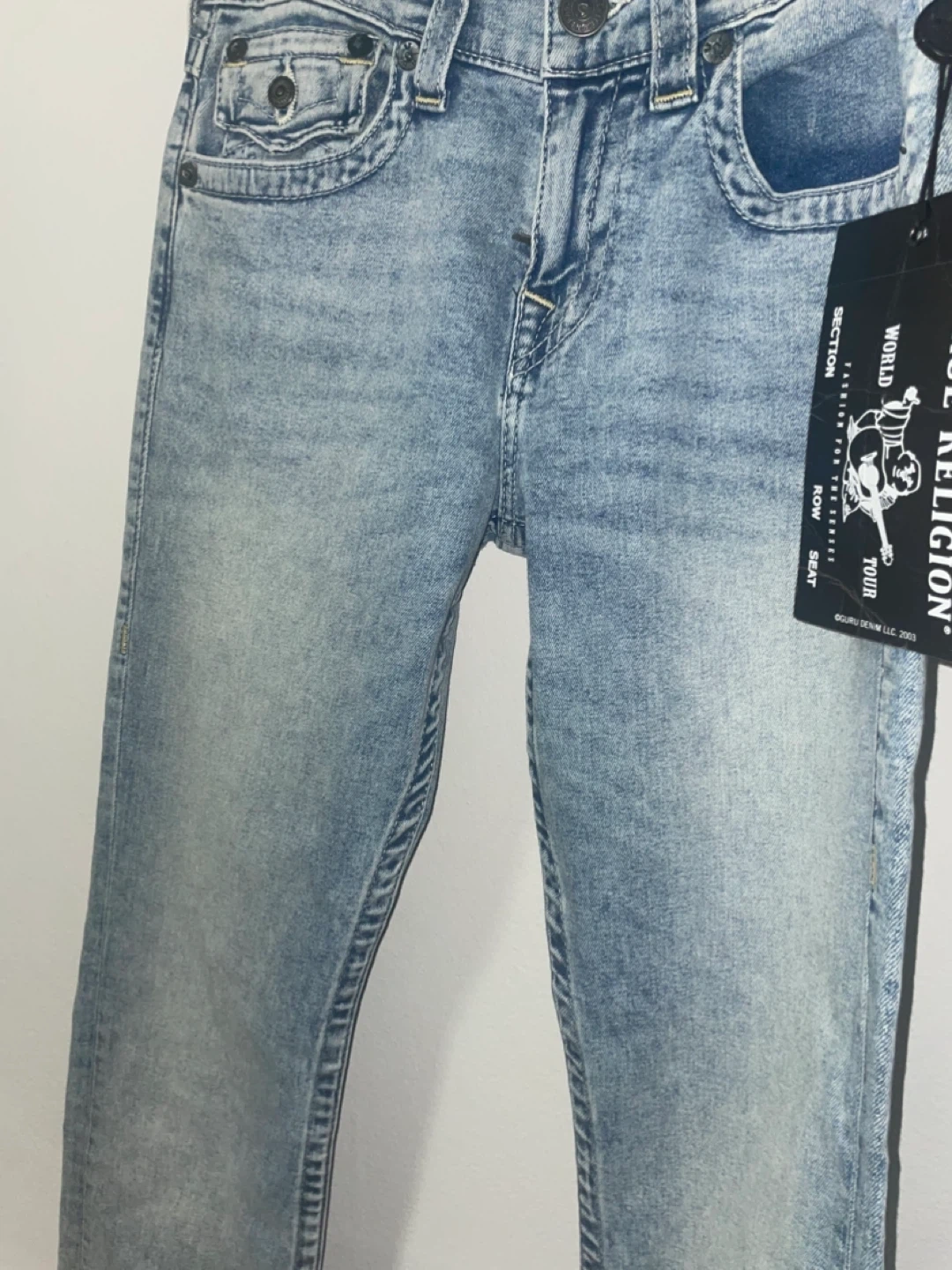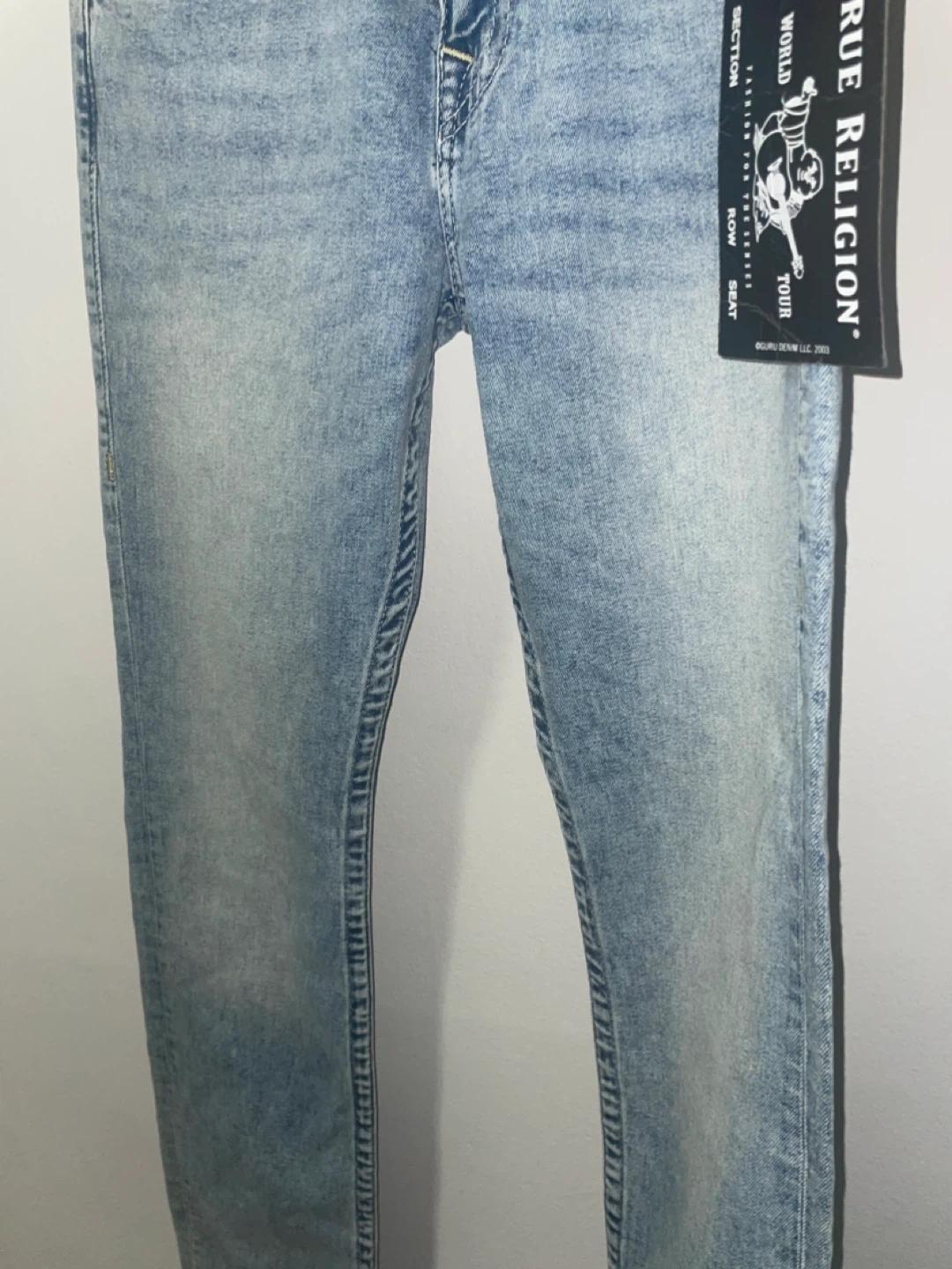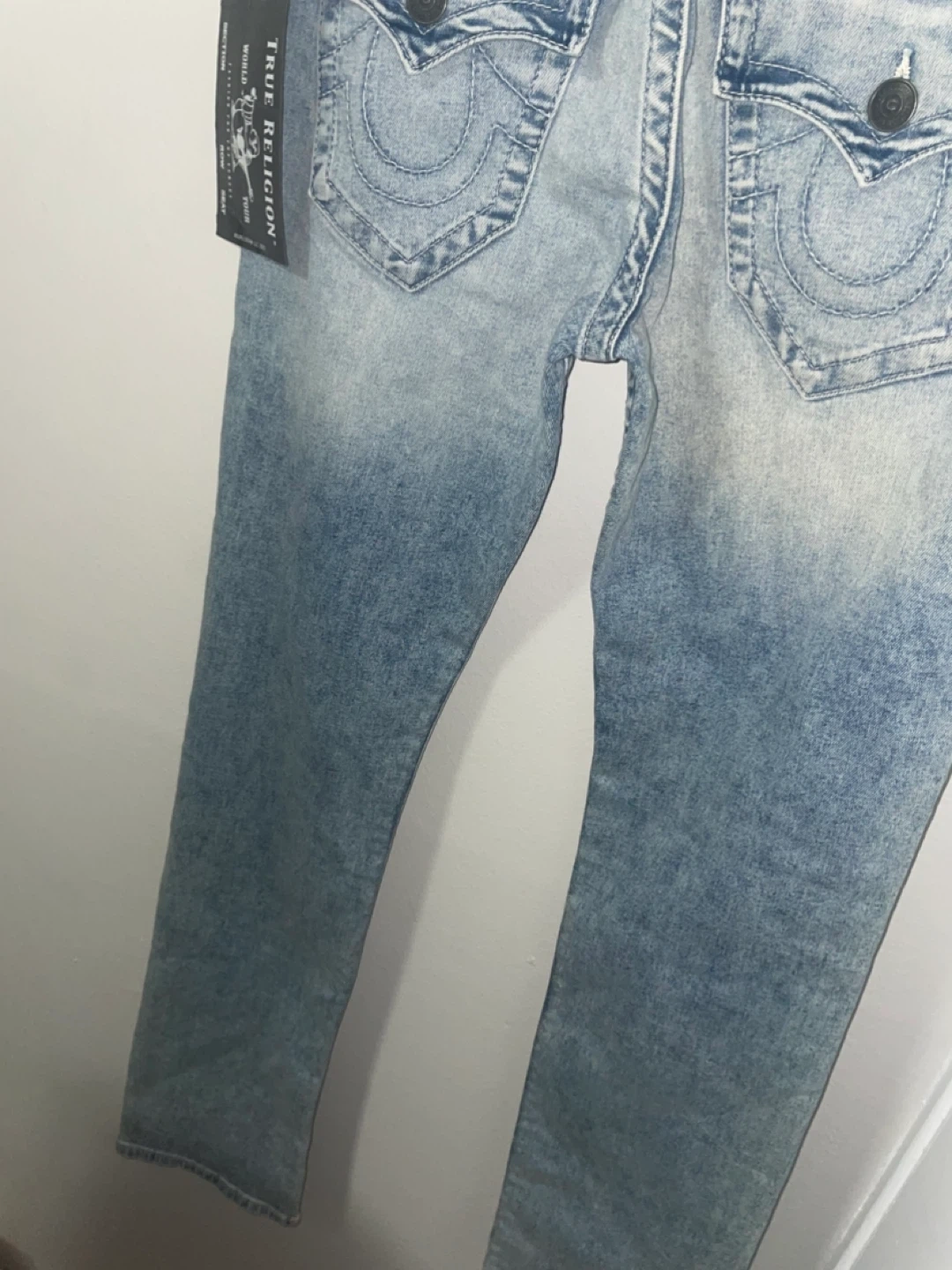 These True Religion jeans come in a stylish light wash denim. They feature the brand's signature stitching and detailing. A great addition to any casual wardrobe! Brand new with tags
