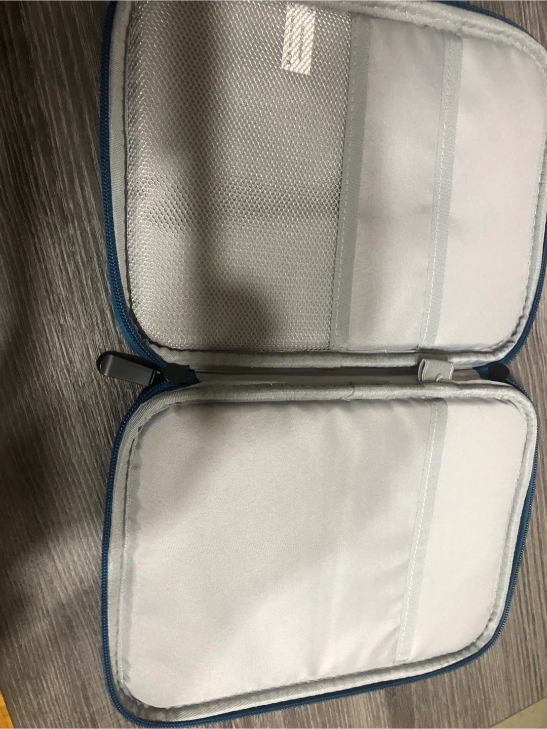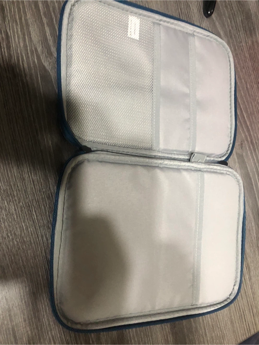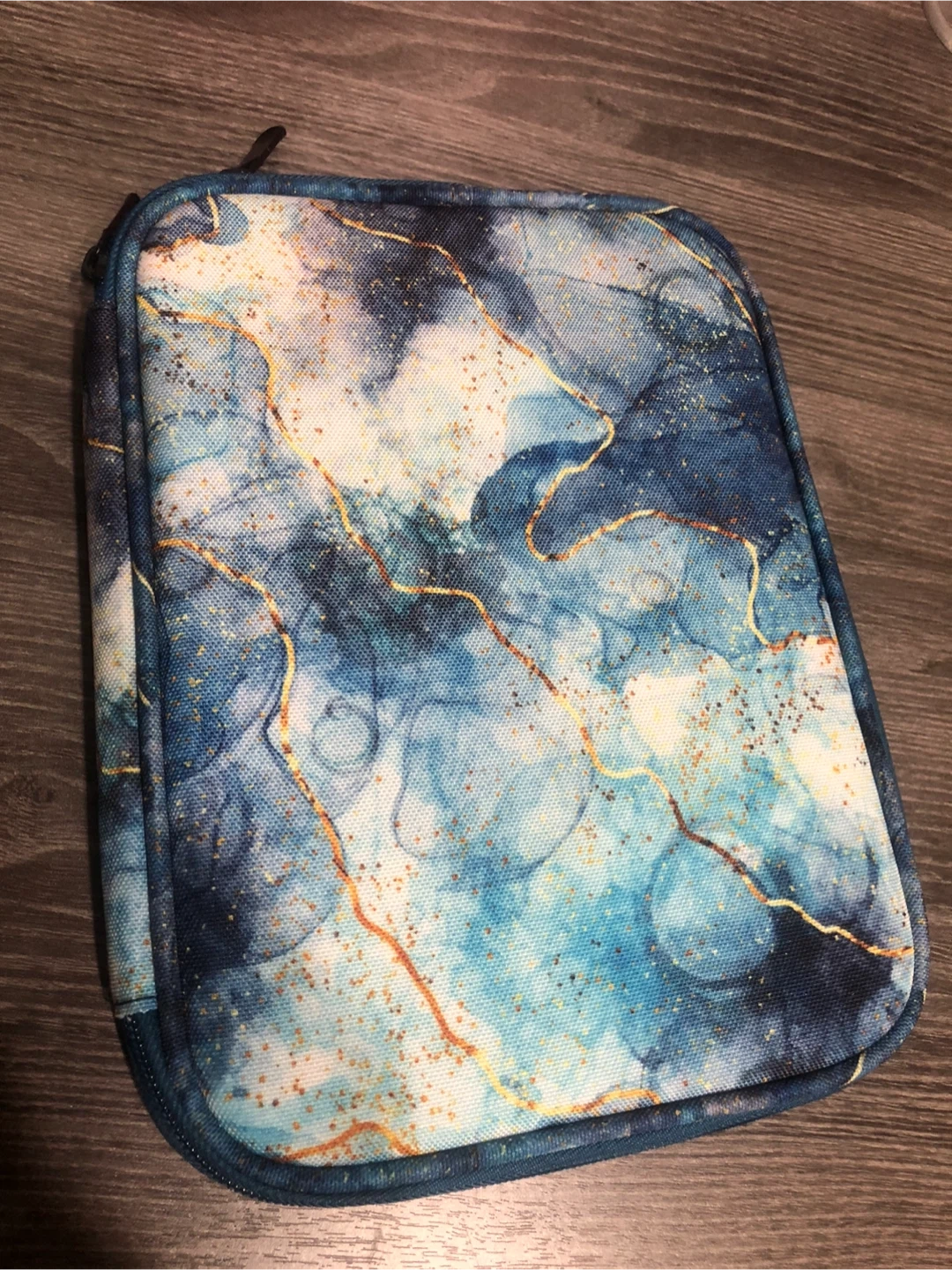 This new zippered pouch features a blue marble design with gold accents. It's got multiple elastic straps and a mesh pocket inside for organization. It's great for storing small electronics, art supplies, or travel essentials!