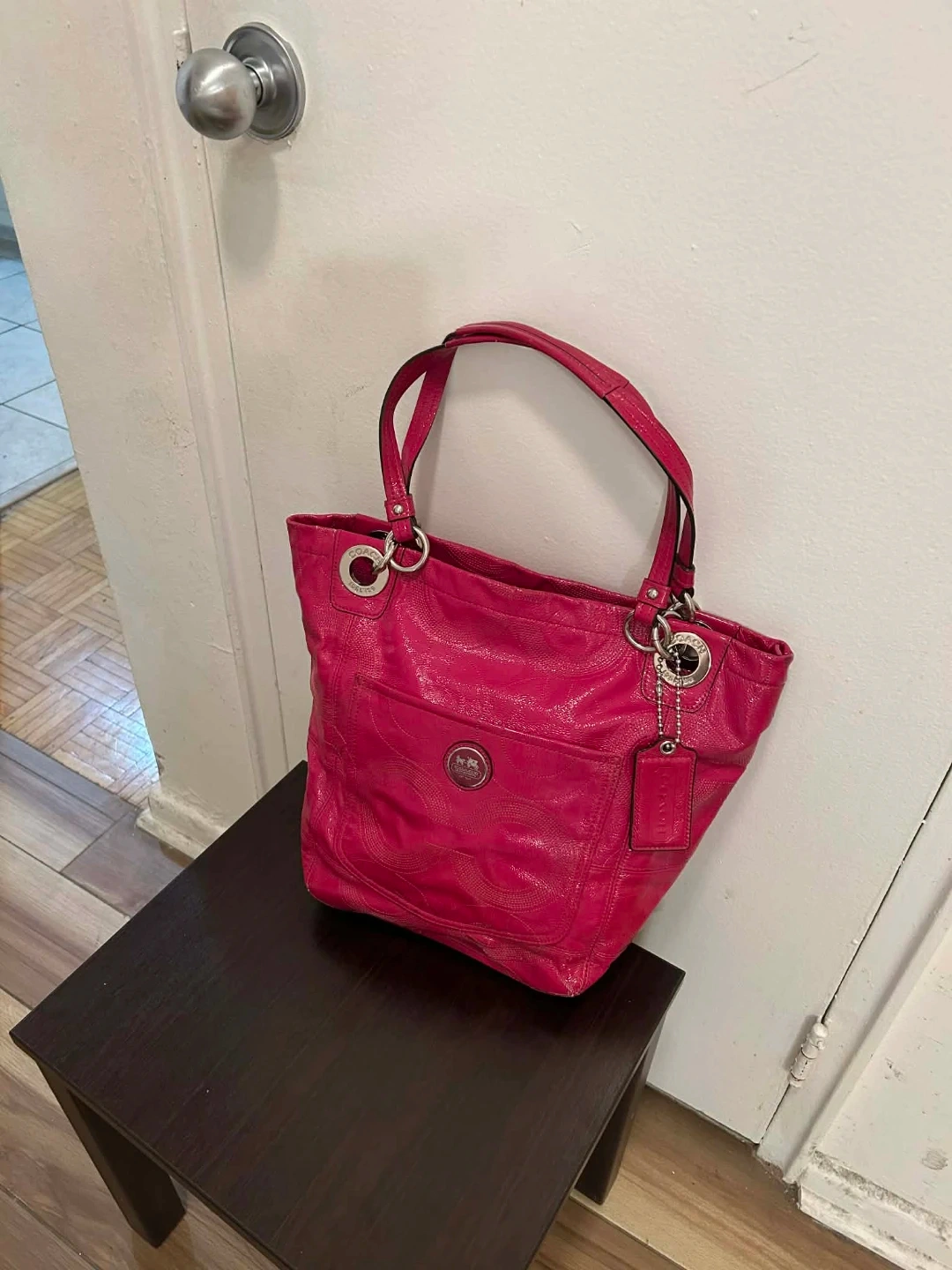 This is a vibrant pink Coach tote bag made from textured leather. It features the classic Coach logo emblem on the front. The bag has dual shoulder straps and a roomy interior for everyday essentials. It's a stylish accessory for any occasion!