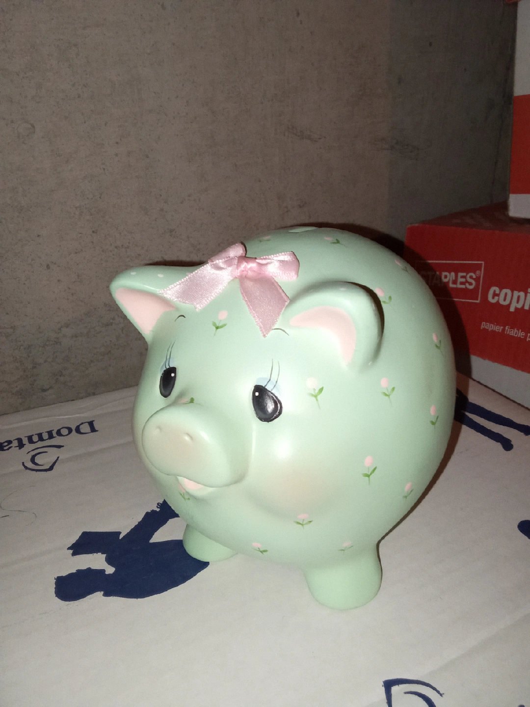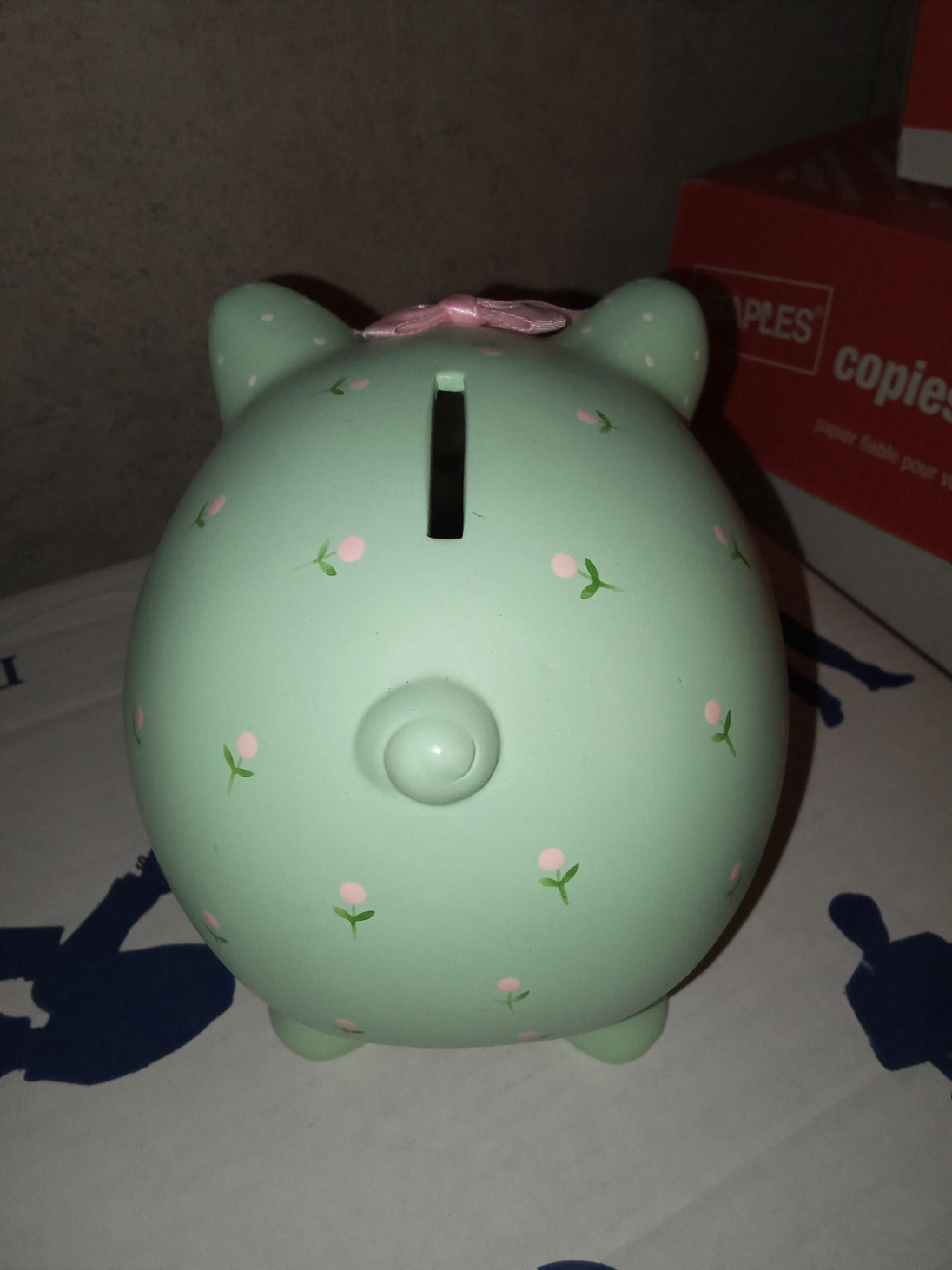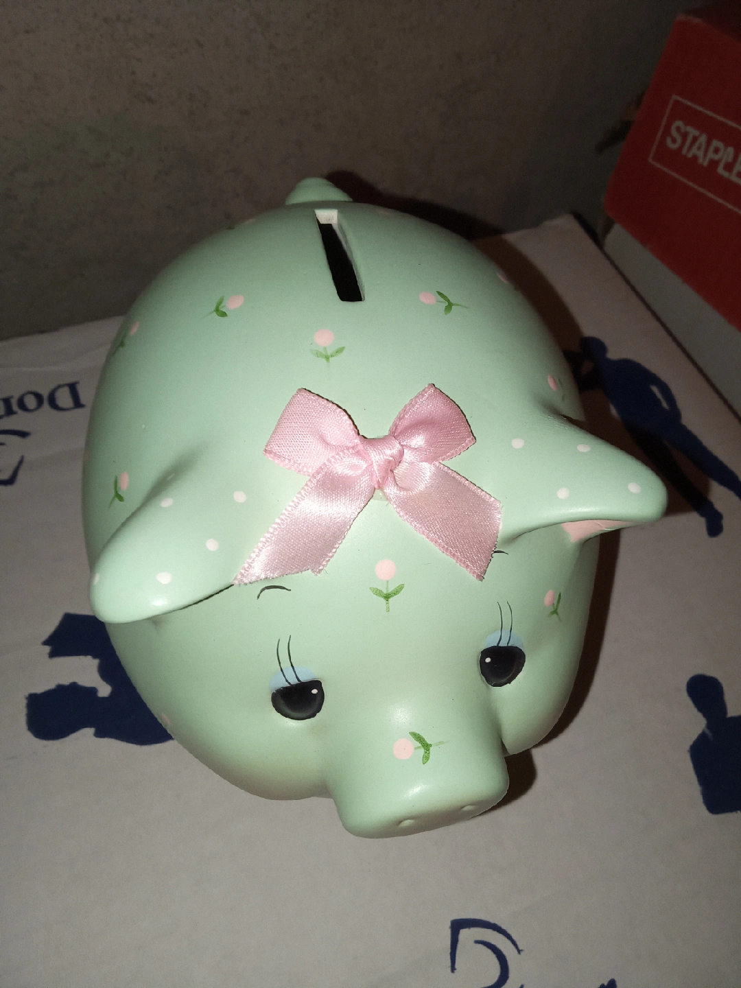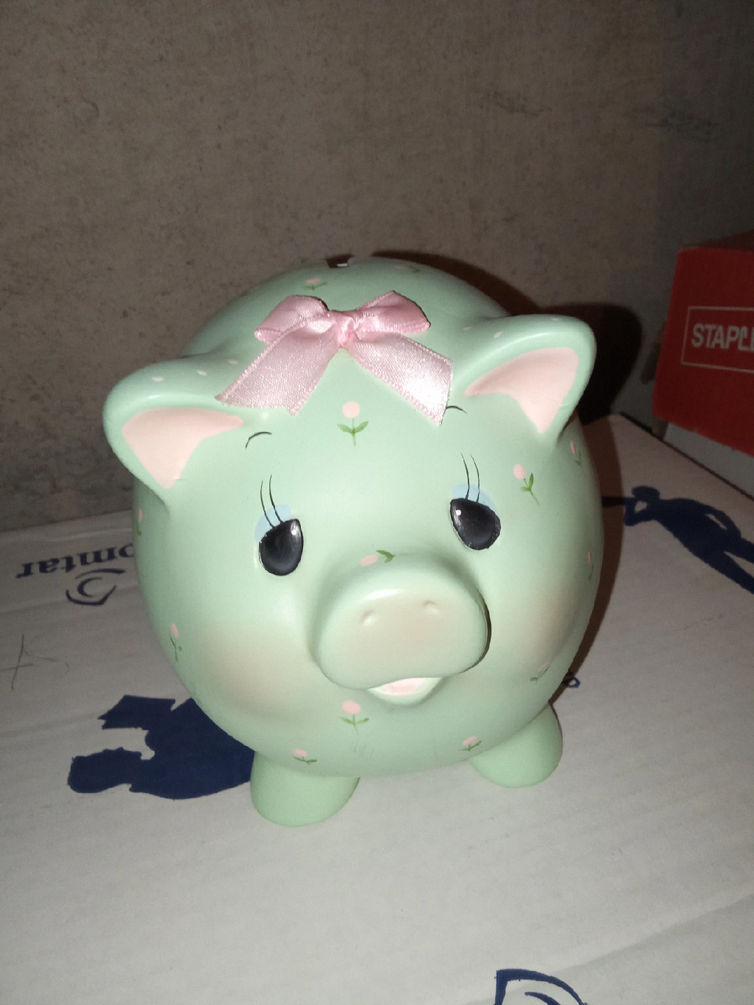 Super cute mint green piggy bank! It's in great shape and ready for a new home. Features a sweet little pink bow and floral details Fastest pick up around Woodbine and Major Mackenzie in Markham