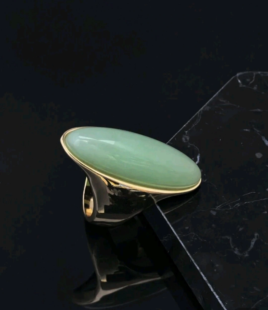 This bold ring features a large, oval-shaped green stone set in a gold-tone metal band. The stone measures approximately 38mm x 24mm (1.49in x 0.94in). It's a striking piece for any jewellery collection!