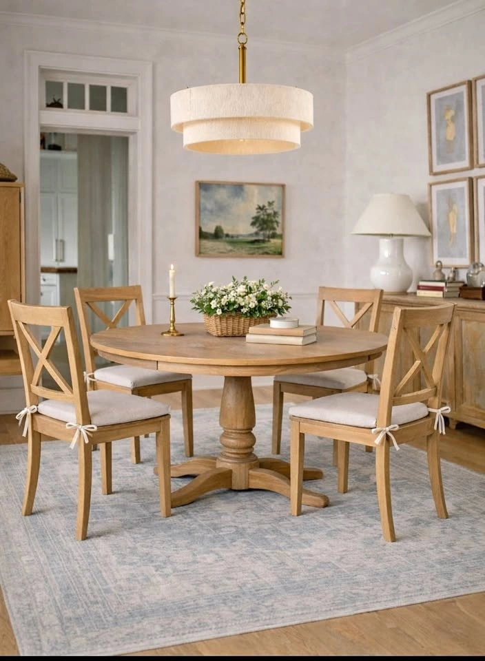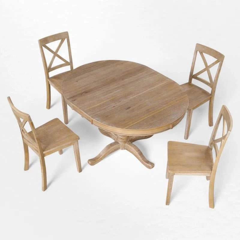 Solid wood dining table that comfortably seats 4–6, and expands to seat up to 8 with the extension leaf. Matching solid wood chairs are included. All pieces are brand new in box.