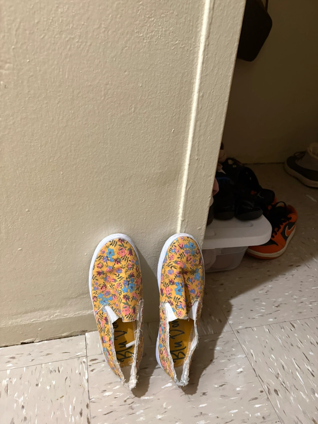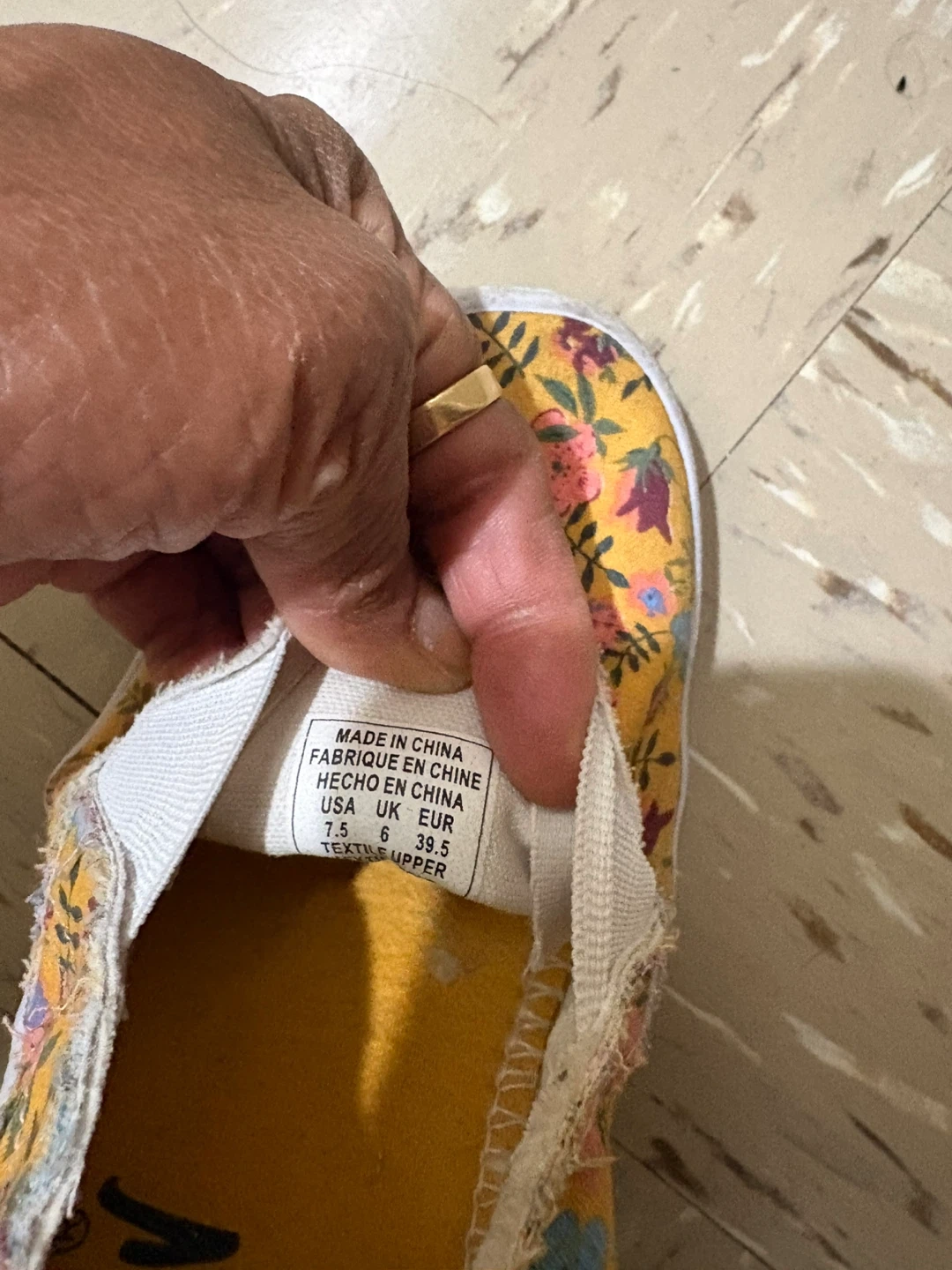 These slip-on canvas shoes feature a vibrant yellow background with a colorful floral print. They have elastic side panels for easy on and off. A comfortable and stylish choice for everyday wear!