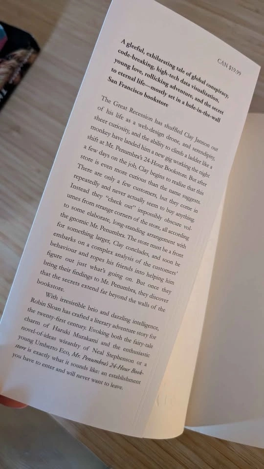 Engaging novel by Robin Sloan. This book is about a web-design drone who starts working at a mysterious 24-hour bookstore. It has a cool story with global conspiracy, code-breaking, and high-tech adventure, set in a San Francisco bookstore. Meet Up: Spadina Subway station. Cash only. Price is firm.