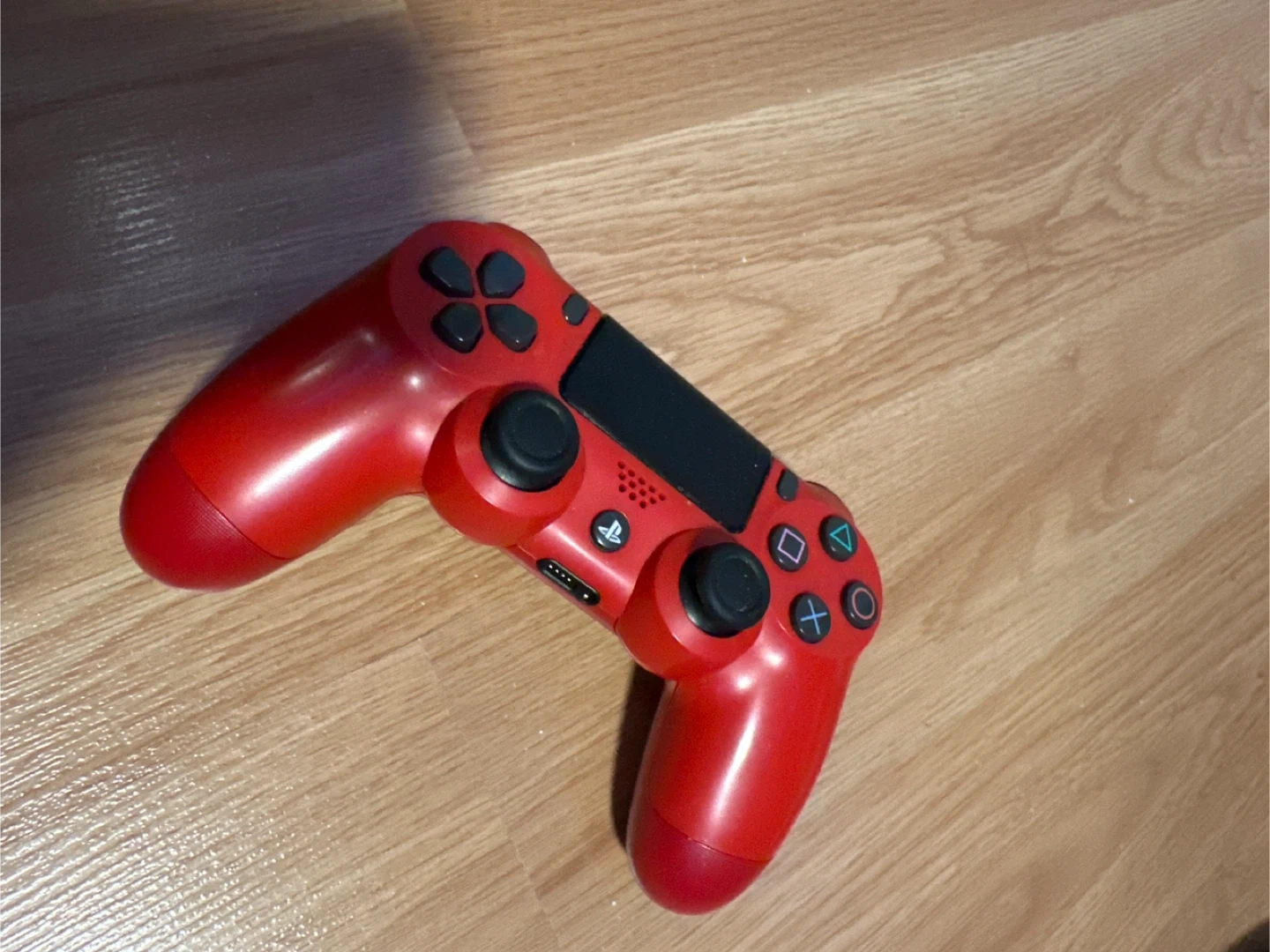 This is a red wireless controller for the PlayStation 4. It's in good condition and ready for your next gaming session! Works wirelessly for more freedom.