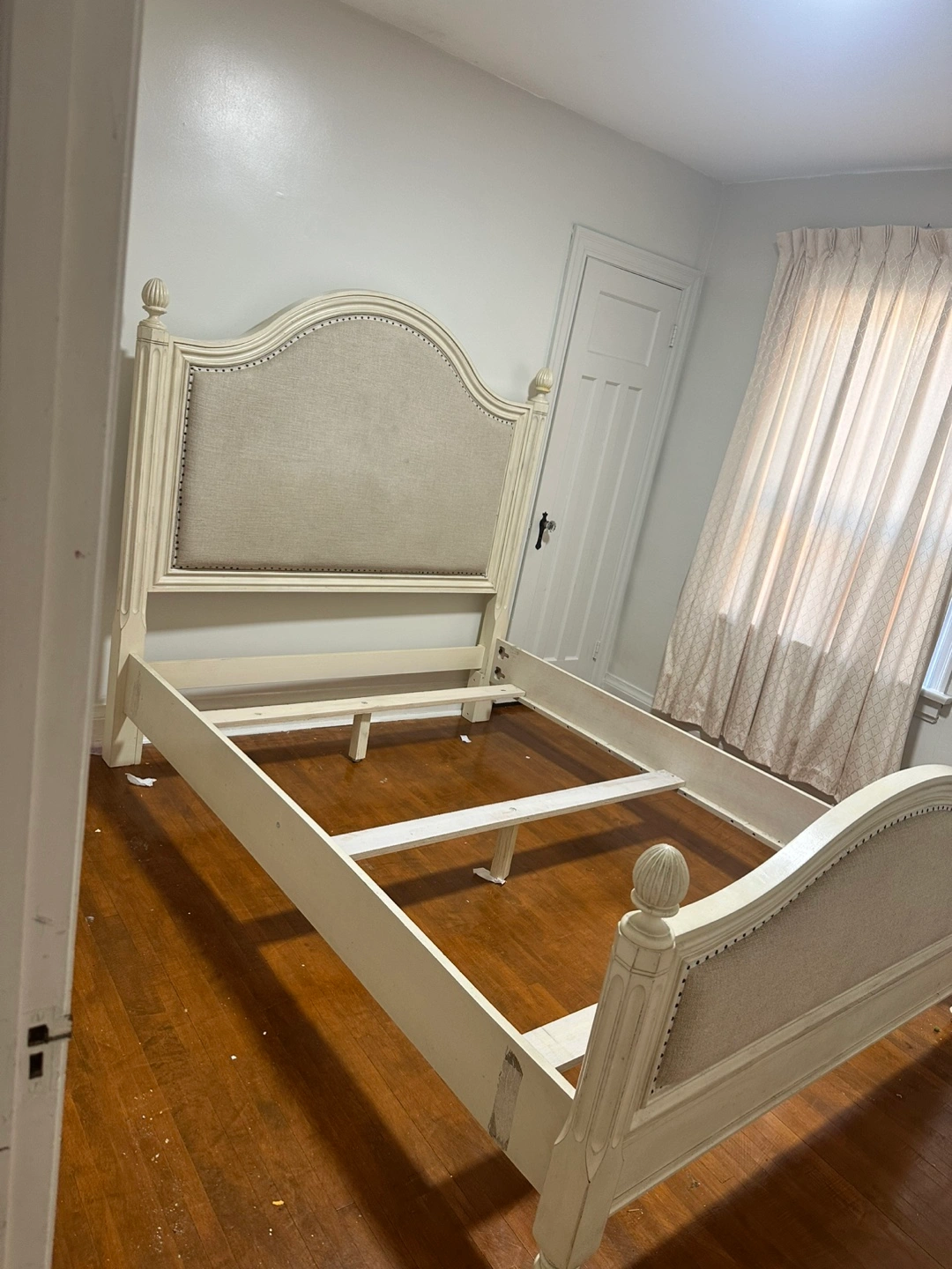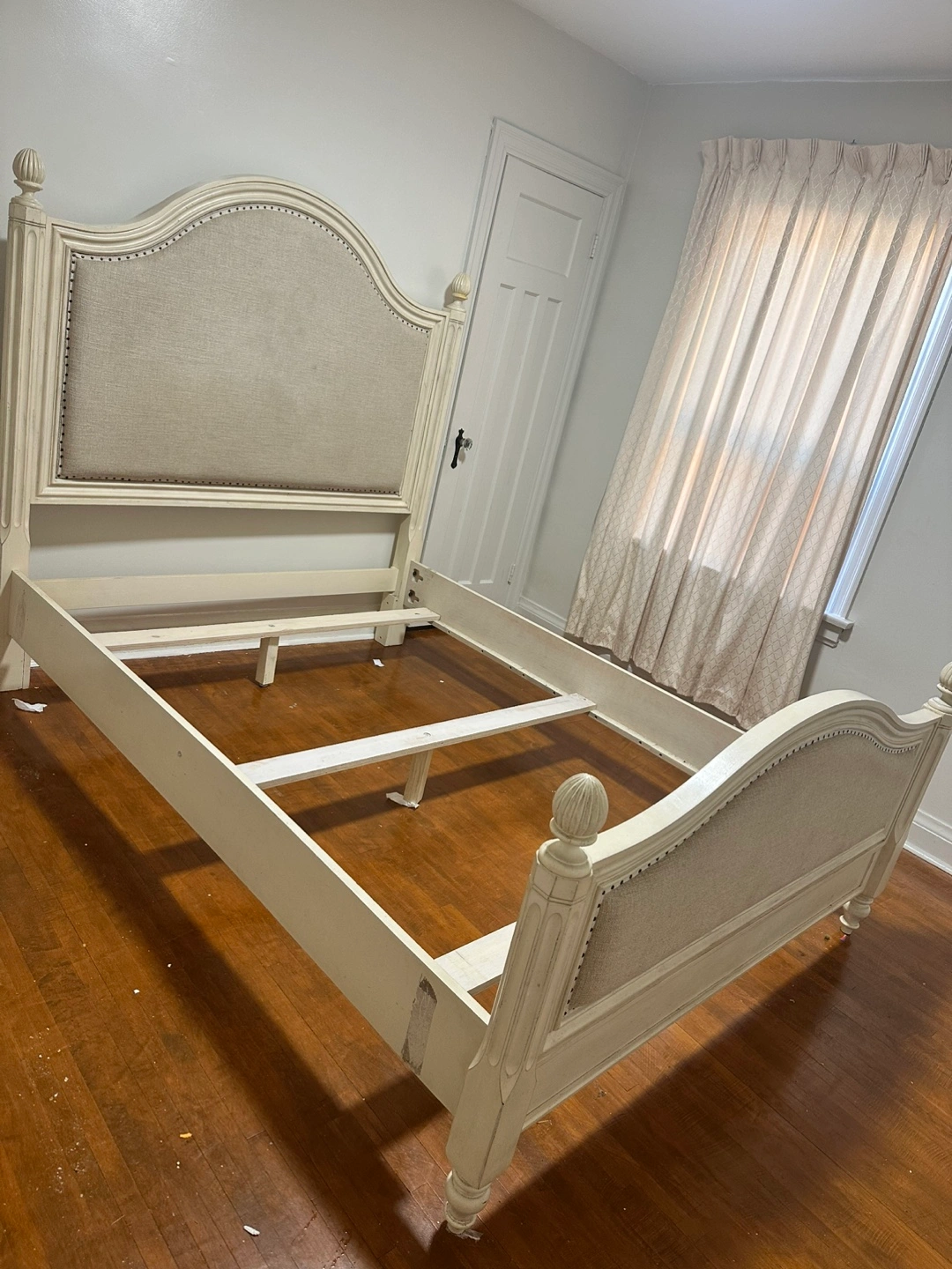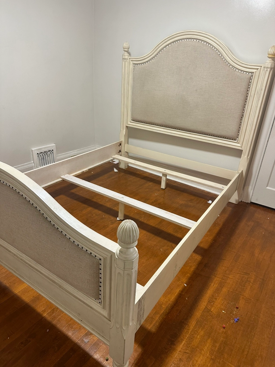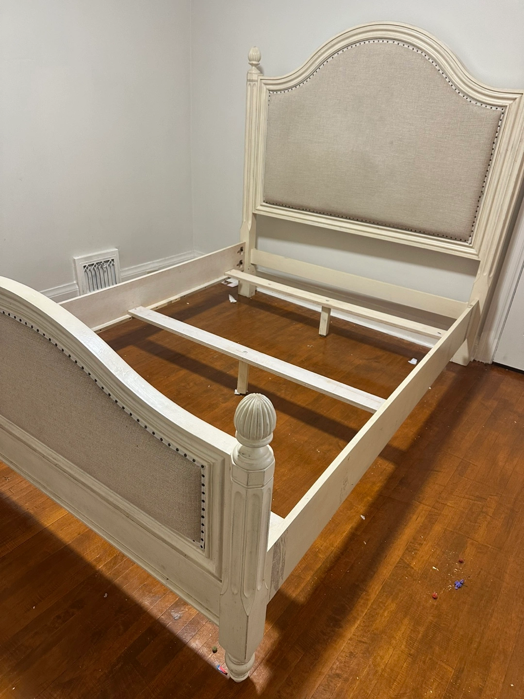 Moving out sale This is a cream upholstered bed frame with a headboard and footboard. It has decorative nailhead trim along the edges of the upholstery. The frame includes slats for mattress support. It's a queen-size bed frame.