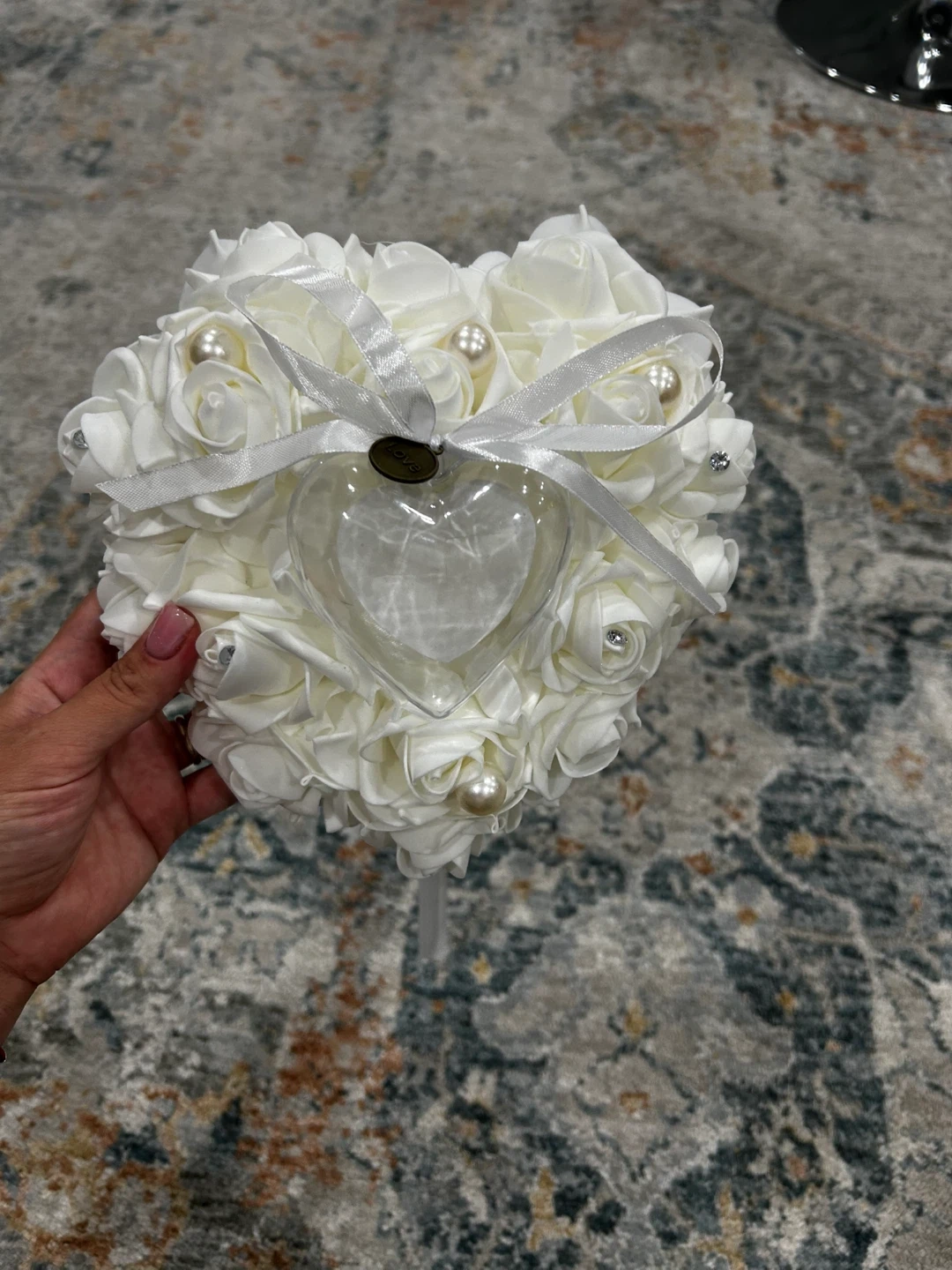 23Selling a beautiful heart-shaped bouquet made of white roses. It features a clear heart-shaped container and ribbon accents. Perfect for a special occasion!