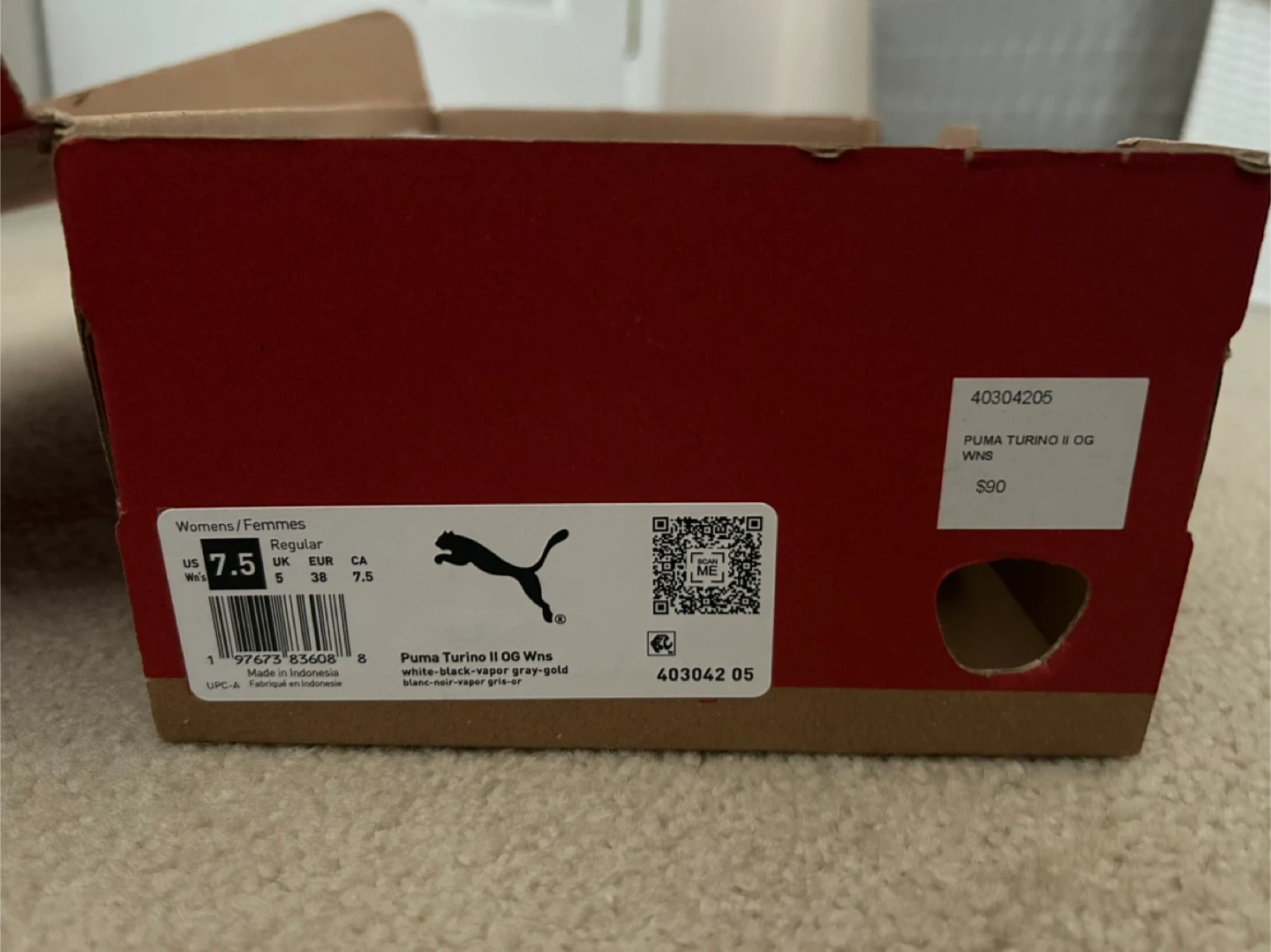 White and black Puma Torino II OG women's sneakers. These shoes are a women's regular size 7.5 US. They're made with a mix of leather and suede for a classic look.