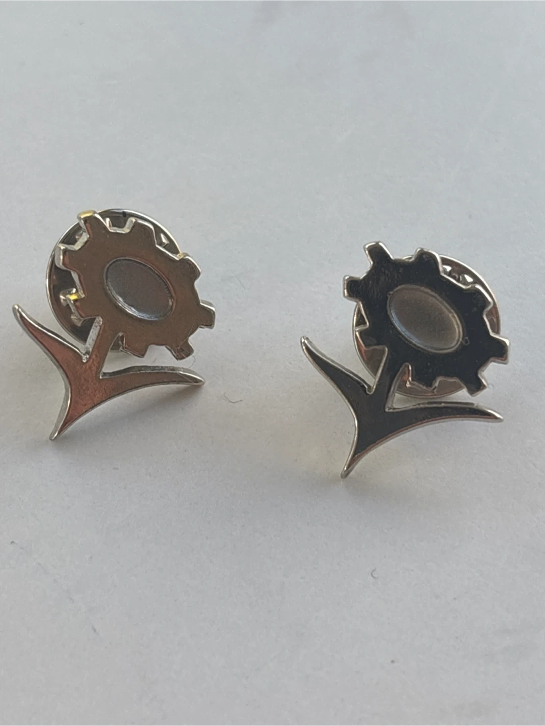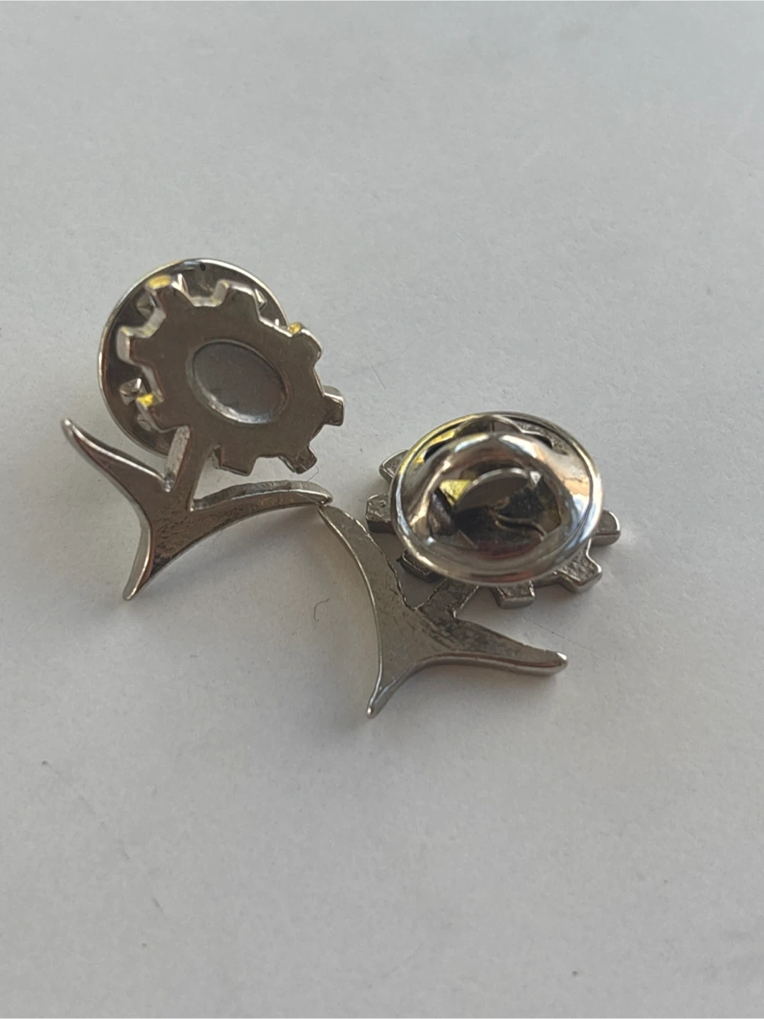 375Selling a set of silver pins featuring a unique gear and arrow design. These pins are in great condition and would be a cool addition to any collection or outfit! Perfect for adding a touch of industrial flair to your style