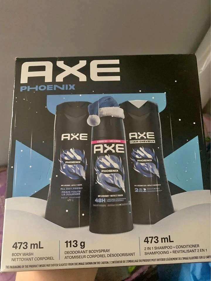 Brand new Axe Phoenix 3-piece set. Includes body wash, deodorant bodyspray, and 2-in-1 shampoo + conditioner. 473 mL body wash, 113 g deodorant bodyspray, and 473 mL shampoo + conditioner.