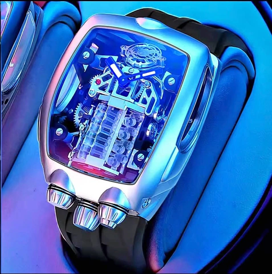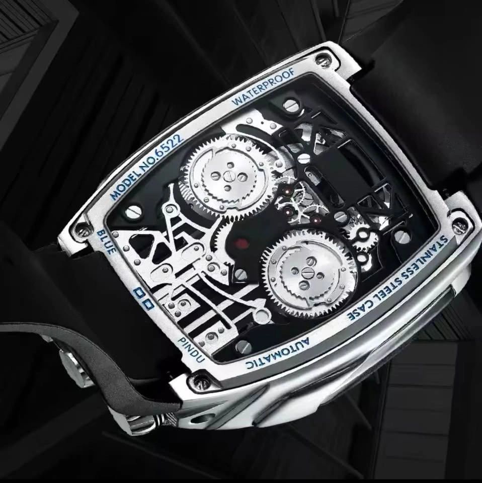 65Limited Stock: Pindu Design Automatic "Engine" Skeleton Watch This is an attention-grabbing mechanical watch that features a bold, unique aesthetic inspired by high-end automotive mechanics and luxury tonneau-shaped cases (like Richard Mille). We have a limited quantity of these Brand New pieces available for sale. Key Features & Specs: • Design: Aggressive, fully exposed skeleton dial with a central "Engine Block" design. • Movement: Reliable and popular Seiko NH35 Automatic (self-winding, no battery needed). • Case: Stainless Steel, Oversized Sporty Look (Approx. 50mm x 42mm). • Strap: Comfortable Blue Silicone Sport Band. • Glass: Mineral Reinforced Glass. Serious inquiries only.