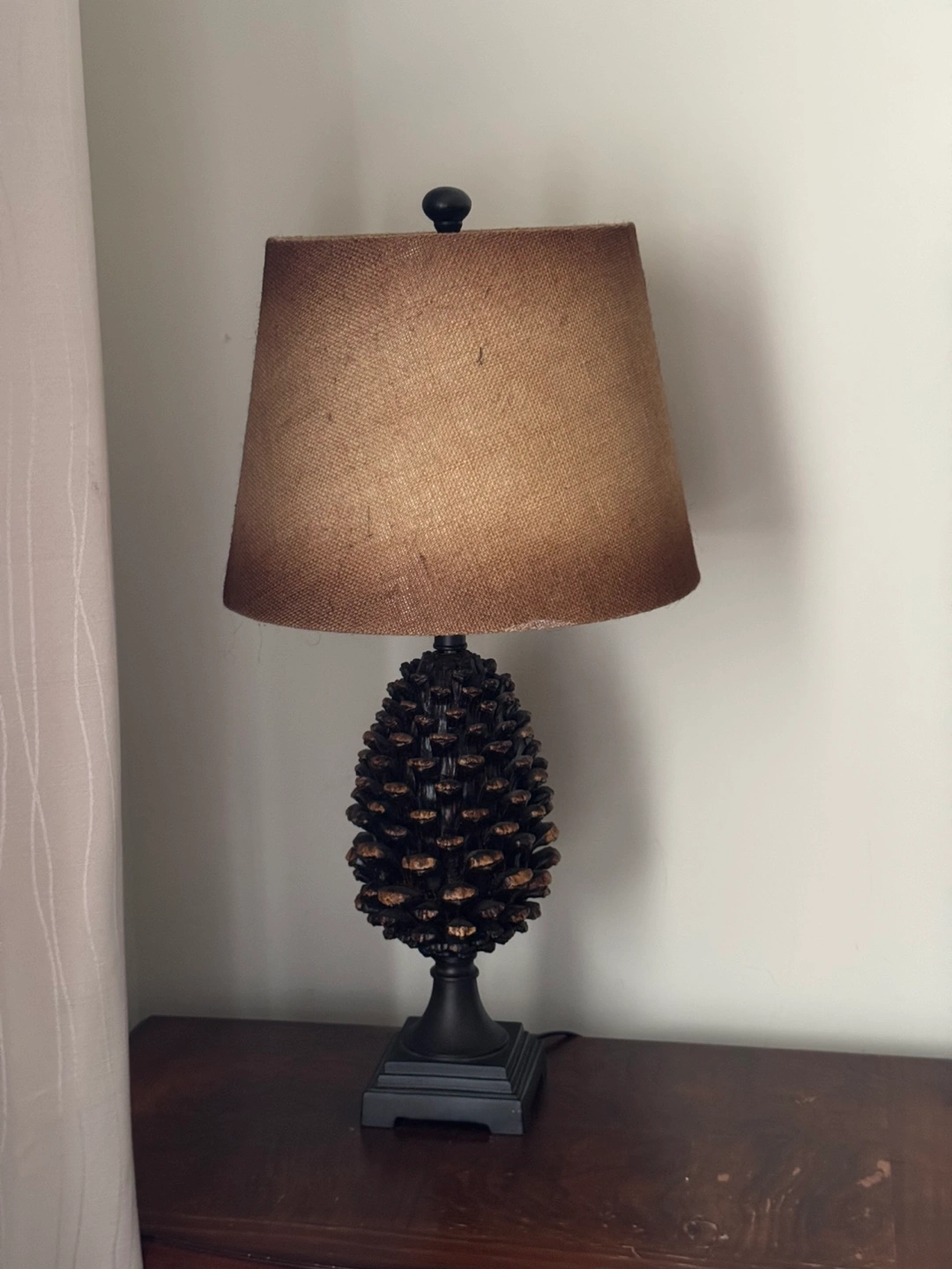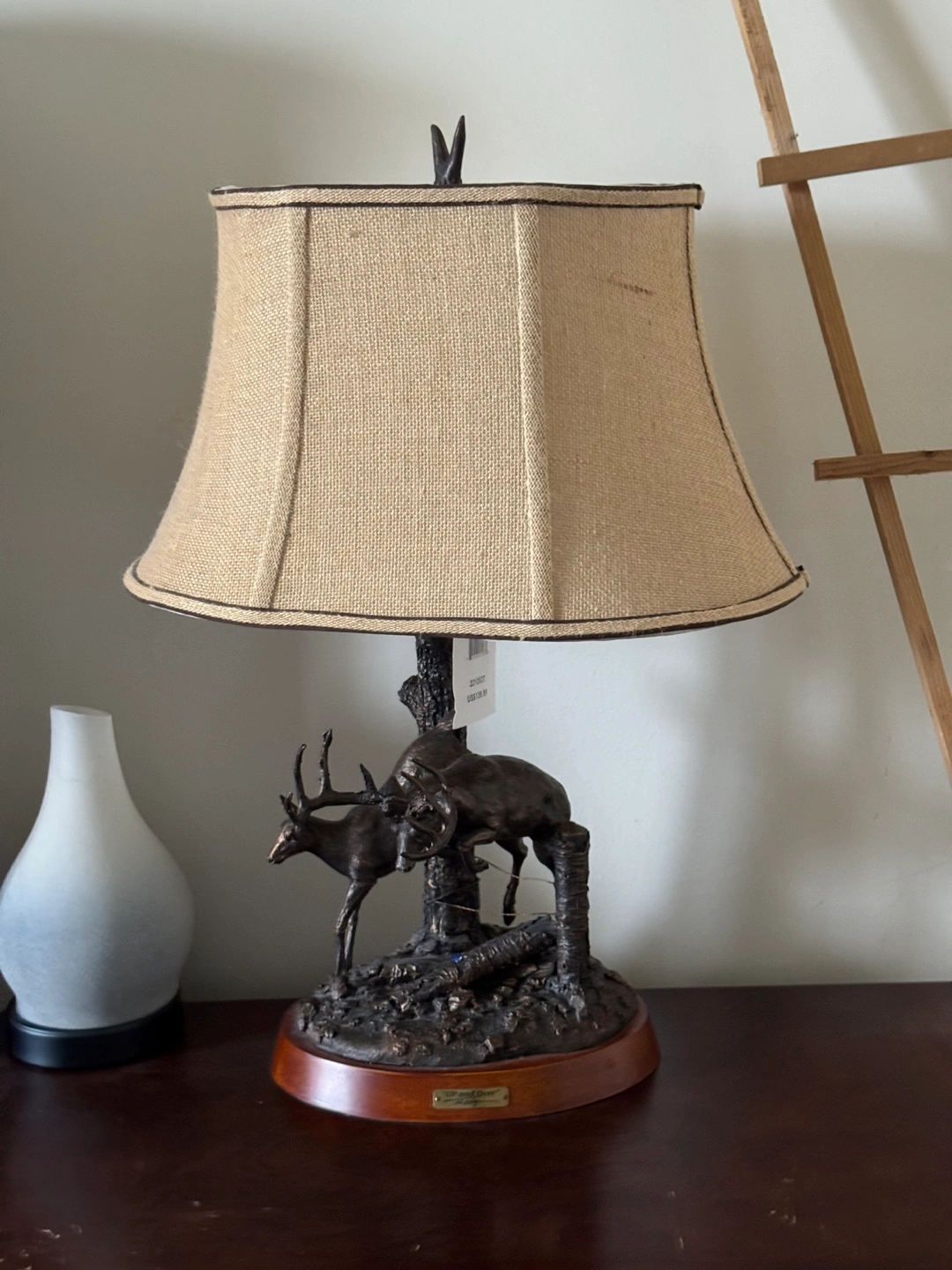 57Two table lamps for sale. One features a pine cone base and a beige lampshade. The other has a deer sculpture base and a beige lampshade. Both are in good condition.