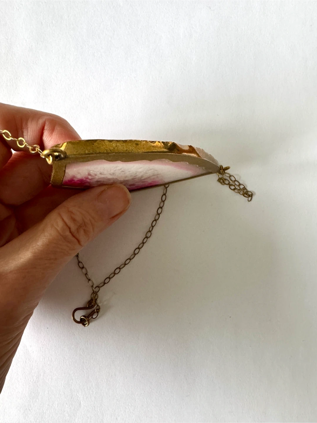 115Cash preferred. Pick up at Broadview/Pottery Rd or can meet at Broadview Subway station. Selling a unique pink agate slice necklace! Handcrafted by Canadian Mexican Jewelry designer Lissa Bowie. The pendant has a beautiful pink and white pattern, framed in a gold-tone setting. The chain is a delicate gold-tone as well. Each piece of chain is about 8 inches long